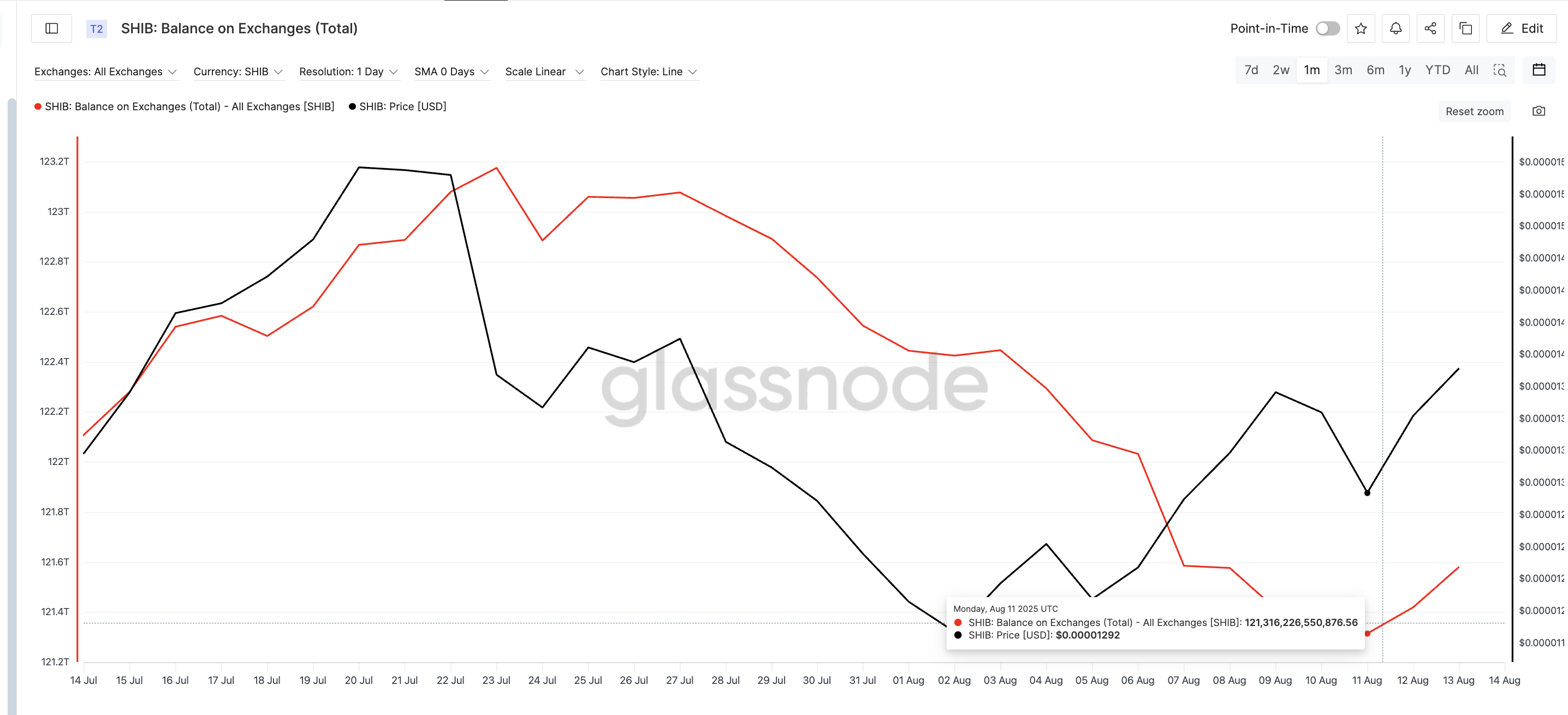 ในกรณีของ SHIB ยอดคงเหลือเมื่อวันที่ 31 กรกฎาคมอยู่ที่ 122.54 ล้านล้านโทเค็น ลดลงเหลือ 121.31 ล้านล้านภายในวันที่ 11 สิงหาคม ซึ่งลดลงเกือบ 1% นี่เป็นสัญญาณของแรงกดดันในการขายที่ลดลง สร้างเงื่อนไขที่ดีสำหรับขาขึ้นในการขยาย การขึ้นราคาของ Shiba Inu