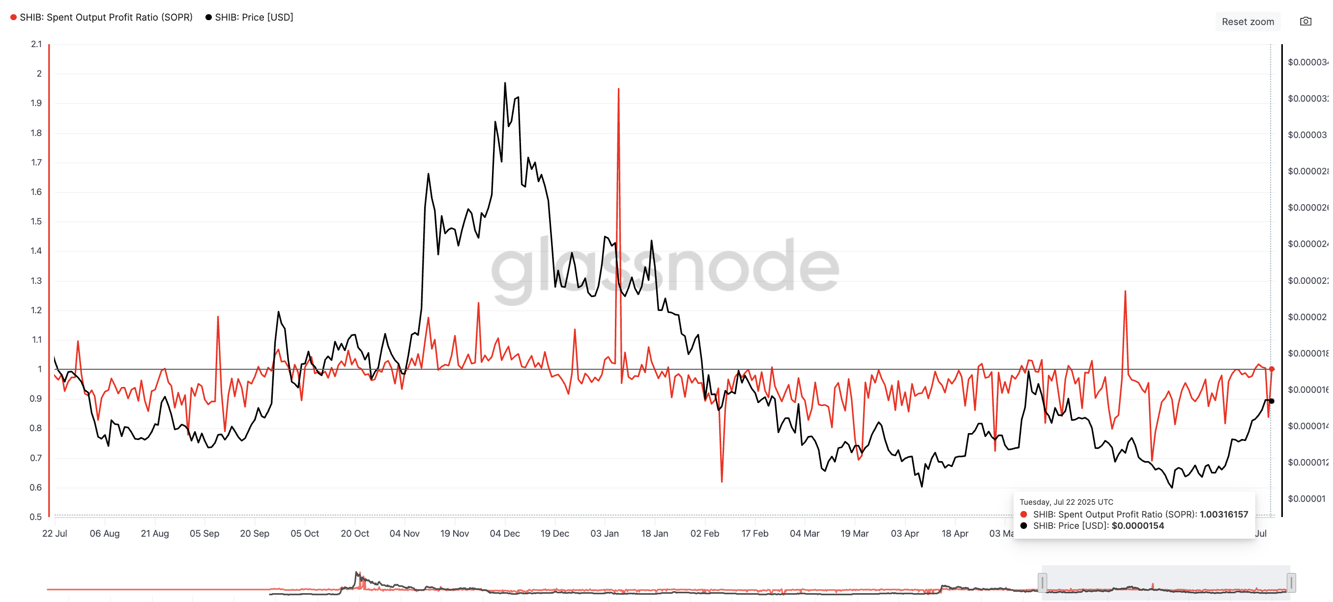เมื่อวันที่ 16 มิถุนายน SOPR ลดลงต่ำกว่าเดิมถึงประมาณ 0.69 เมื่อราคาประมาณ USD0.00001188 ราคาต่อมาขึ้น ประมาณ 30% ไปที่ประมาณ USD0.00001546 และ SOPR เคลื่อนไปที่ 1.0 อีกครั้ง SOPR ของ SHIB ลดลงอีกครั้งเป็น 0.83 สองวันก่อนหน้านี้ การขึ้นราคาที่สอดคล้องกันยังคงรออยู่
