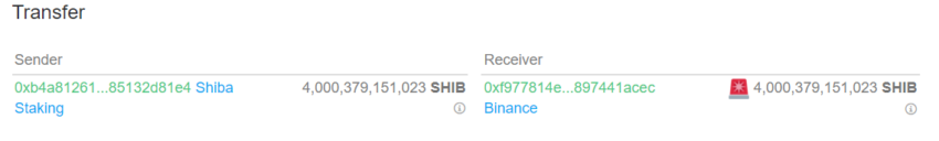 เมื่อวันที่ 9 มิถุนายน Whale Alert ซึ่งทำหน้าที่ศึกษาความเป็นไปของ Blockchain ได้รายงานธุรกรรมครั้งสำคัญที่เกี่ยวข้องกับการโอนโทเค็น Shiba Inu จำนวน 4 ล้านล้านเหรียญไปยัง Binance
