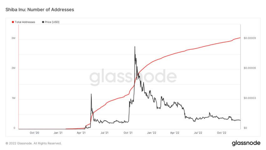จากข้อมูลของ Glassnode จำนวนที่อยู่ในเครือข่าย Shiba Inu ได้ถึงจุดสูงสุดใหม่แล้ว ตัวเลขดังกล่าวมีที่อยู่มากกว่า 3 ล้านแห่งและยังคงเพิ่มขึ้นอย่างต่อเนื่อง อย่างไรก็ตาม ไม่สามารถพูดได้เหมือนกันสำหรับราคาโทเค็น
