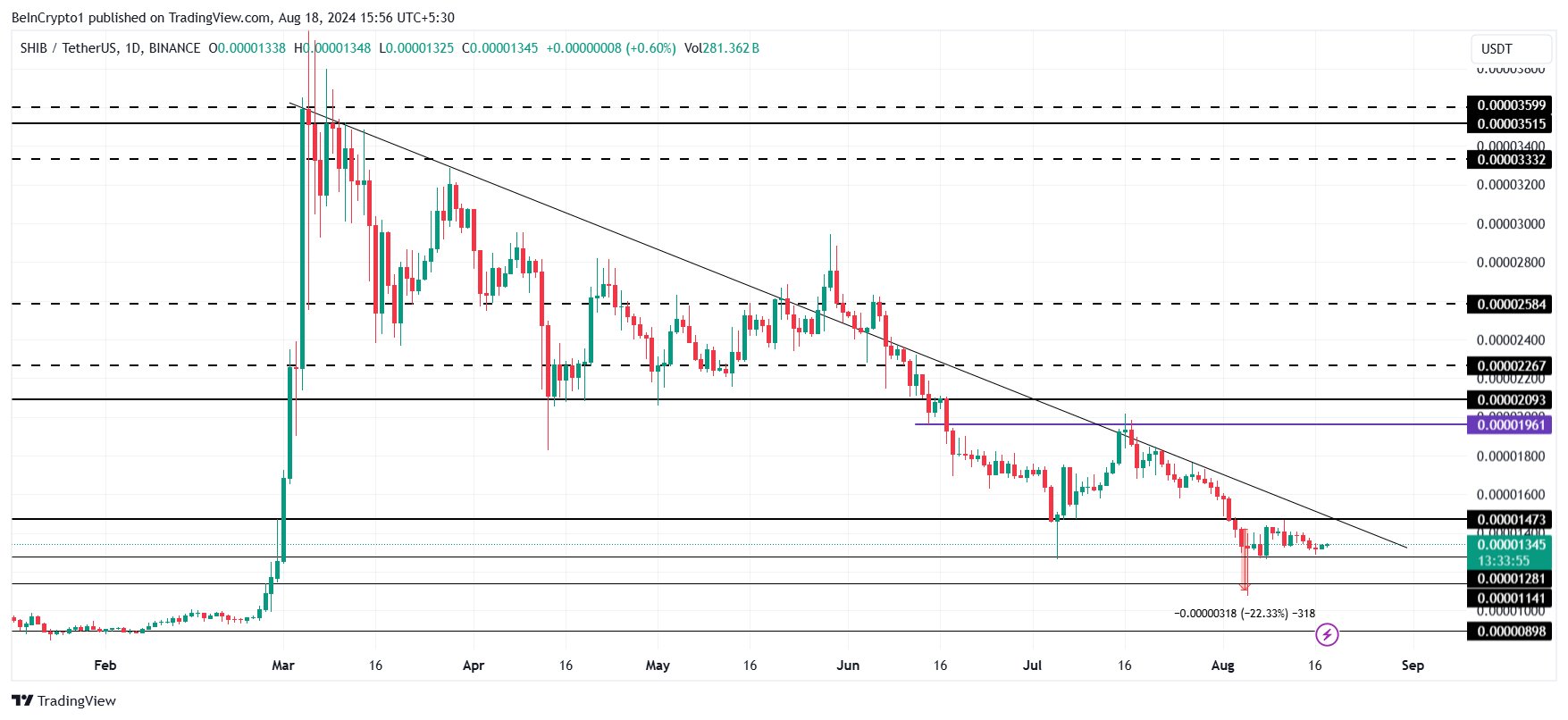 ราคาของ Shiba Inu ที่ 0.00001345 ดอลลาร์กําลังตั้งเป้าที่จะฝ่าฝืนแนวโน้มขาลงห้าเดือน เหรียญมีมสามารถฝ่าฝืนเส้นนี้ได้เพียงสามครั้งตั้งแต่ต้นเดือนมีนาคม