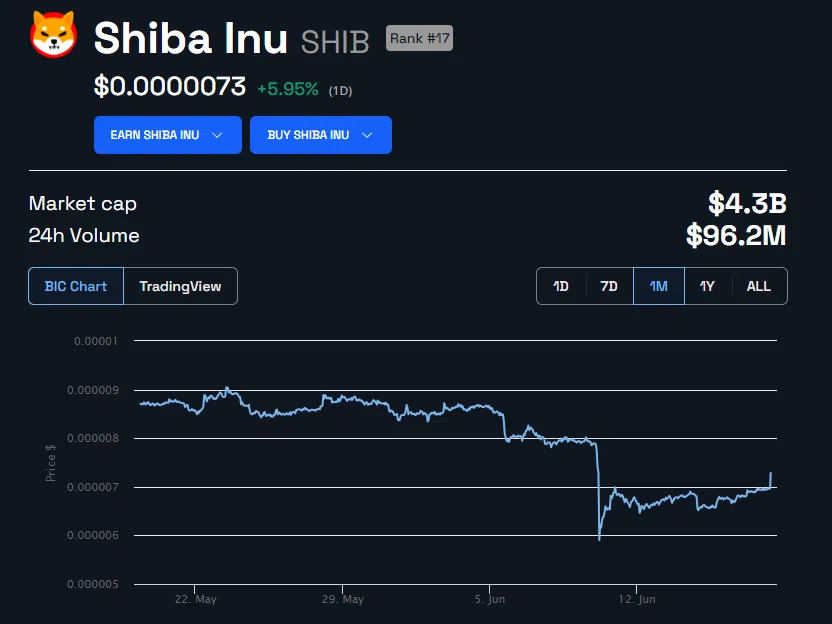 ข้อมูลจาก BeInCrypto แสดงให้เห็นว่ามูลค่าตลาดของ Shiba Inu ปัจจุบันอยู่ที่ 4.3 พันล้านดอลลาร์สหรัฐฯ การลดลงนี้สอดคล้องกับราคาสินทรัพย์ดิจิทัลที่ร่วงลงอย่างมาก โดยลดลงต่ำสุดที่ 0.000005979 ดอลลาร์สหรัฐฯ ก่อนจะดีดตัวขึ้นเป็น ระดับปัจจุบันที่ 0.0000073 ดอลลาร์สหรัฐฯ ณ เวลาปัจจุบัน