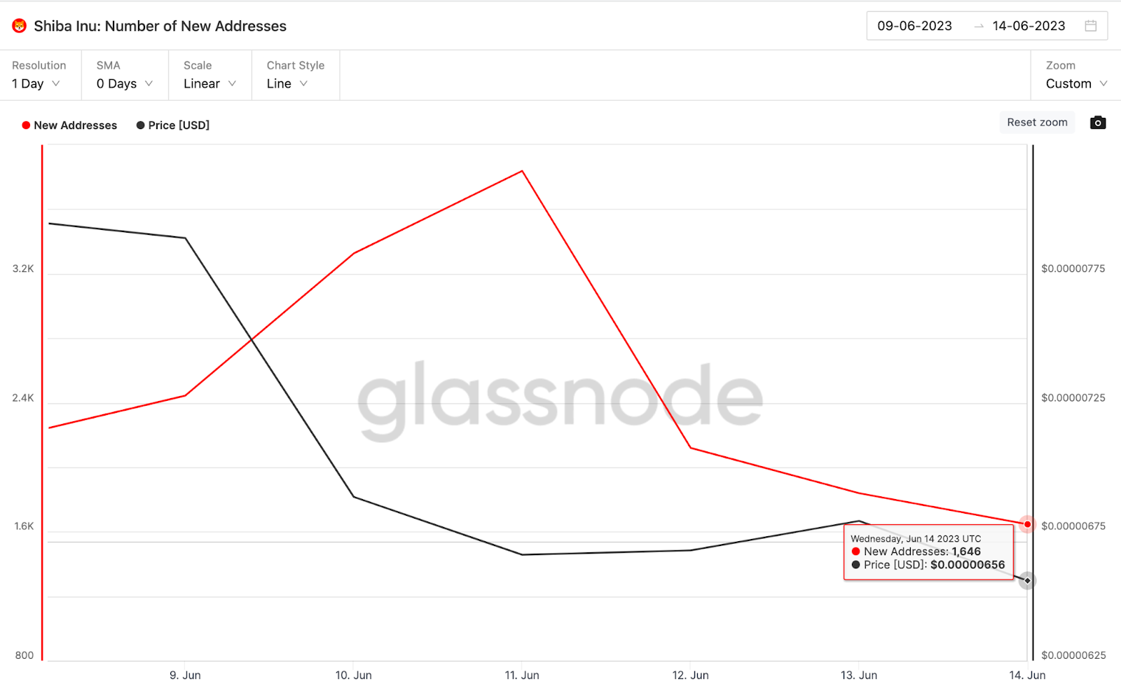 ข้อมูลจาก Santiment เปิดเผยว่า SHIB ประสบความยากลำบากในการดึงดูดผู้ใช้งานใหม่ตั้งแต่สัปดาห์ที่ผ่านมา ชาร์ตของ Glassnode แสดงให้เห็นแอดเดรสรายใหม่ที่ถูกสร้างบน Shiba Inu Network Growth ซึ่งอยู่ในช่วงขาลงตั้งแต่วันที่ 11 มิถุนายน 2023