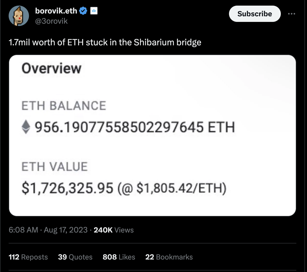 ตั้งแต่วันพฤหัสบดีที่ผ่านมา สมาชิกชุมชนบางคนอ้างว่ามี Ethereum (ETH) มากกว่า 1.7 ล้านดอลลาร์ติดอยู่ใน Shibarium Bridge