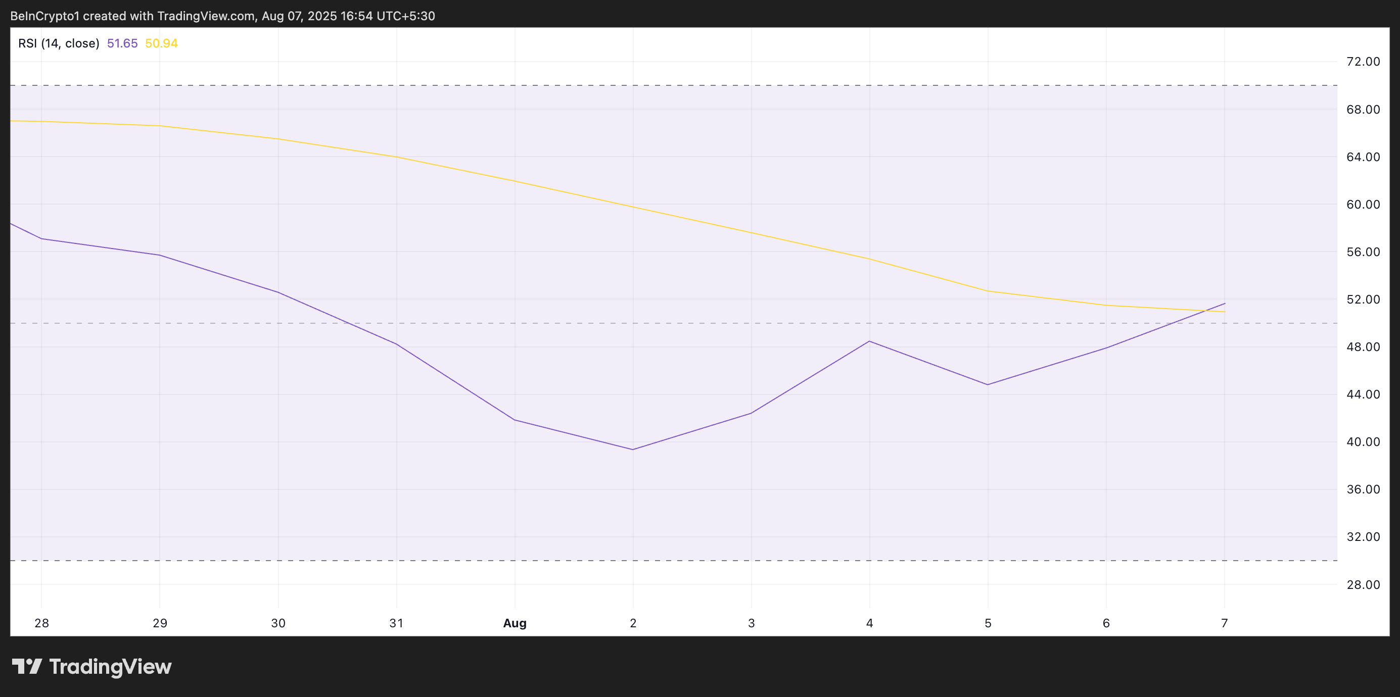 ที่ 51.65 และกำลังเพิ่มขึ้น RSI ของ SOL บ่งบอกถึงโมเมนตัมขาขึ้นที่แข็งแกร่งขึ้น ผู้ซื้อกำลังค่อยๆ กลับมาควบคุม ทำให้มีโอกาสเพิ่มขึ้นอีกหากความต้องการยังคงเพิ่มขึ้น
