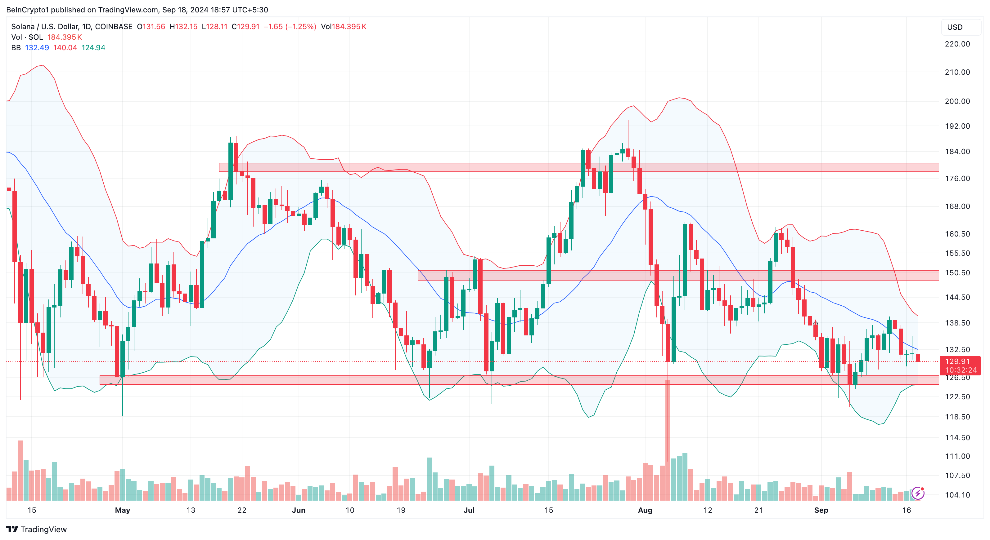 ในกรอบเวลารายวัน ราคาของ Solana ลดลงเหลือ 130 ดอลลาร์ ต่ำกว่าแถบกลางของ Bollinger Bands BB สองวันที่ผ่านมาราคาอยู่เหนือจุดกลางหากยังคงอยู่ที่นั่น อาจเพิ่มโอกาสในการเพิ่มราคาได้