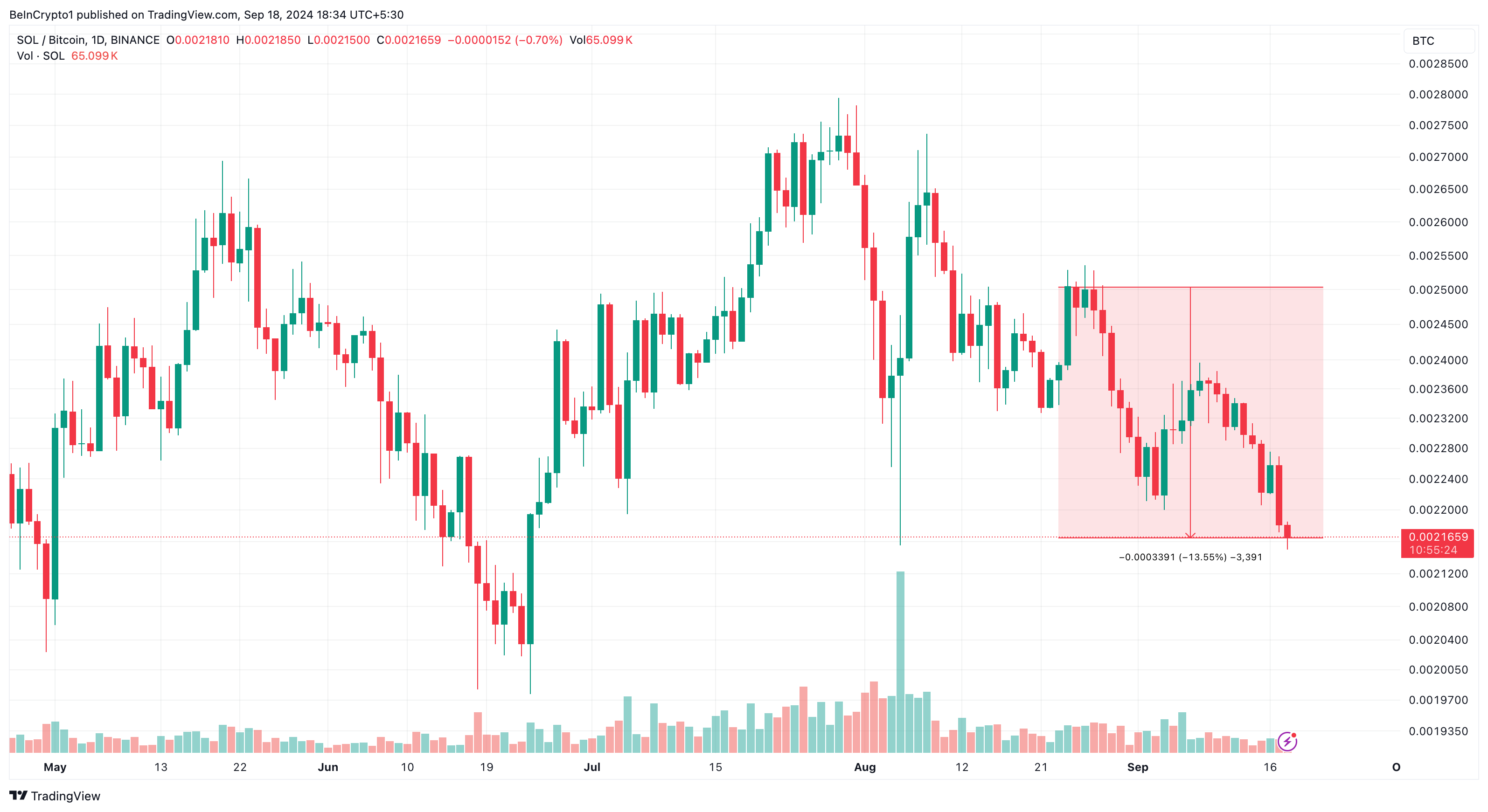 แม้ว่าคู่นี้จะพุ่งขึ้นอีกครั้งในช่วงปลายเดือนสิงหาคม แต่กราฟรายวันแสดงให้เห็นการลดลง 13% จากจุดสูงสุด ทำให้ค่าลดลงเป็น 0.0021 การลดลงนี้เน้นย้ำว่า แม้ว่า Bitcoin จะมีความผันผวน แต่ Solana ก็ยังทำผลงานได้ไม่ดีเท่า BTC ในช่วงเวลาที่ผ่านมา