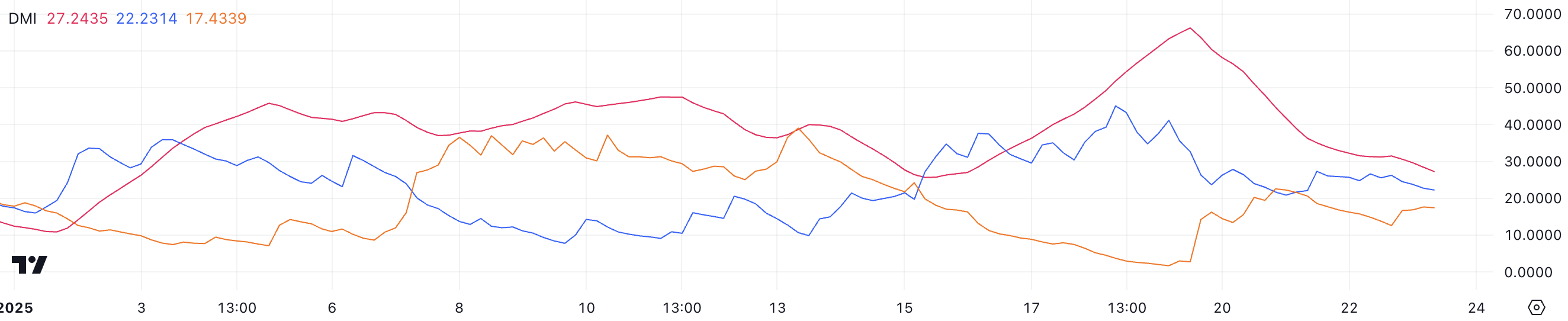 ADX วัดความแข็งแกร่งของแนวโน้มโดยไม่คำนึงถึงทิศทาง โดยการอ่านค่ามากกว่า 25 บ่งบอกถึงแนวโน้มที่แข็งแกร่ง และต่ำกว่า 20 บ่งบอกถึงแนวโน้มที่อ่อนแอ การอ่านค่า 27.2 ในปัจจุบันแสดงให้เห็นว่าแนวโน้มยังคงแข็งแกร่ง แต่กำลังอ่อนตัวลงอย่างมากจากระดับที่แข็งแกร่งมากเมื่อเร็วๆ นี้