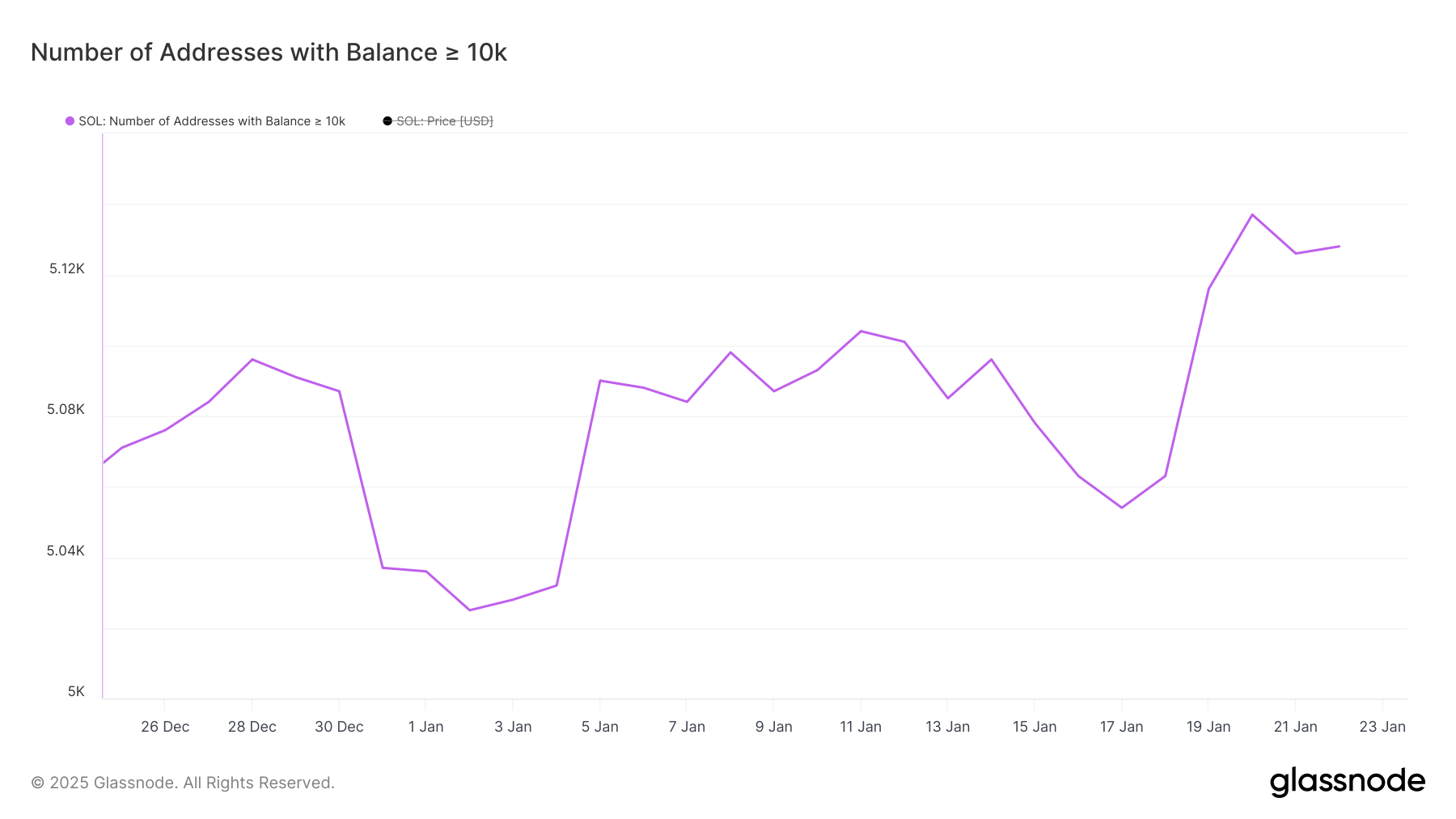 จำนวนวาฬที่สูงในปัจจุบัน ซึ่งเพิ่มขึ้นจาก 5,054 เมื่อวันที่ 17 มกราคม เป็น 5,128 ในเวลาเพียงหกวัน บ่งบอกถึงความเชื่อมั่นของสถาบันที่แข็งแกร่งใน SOL แม้จะมีการลดลงเล็กน้อยเมื่อเร็วๆ นี้