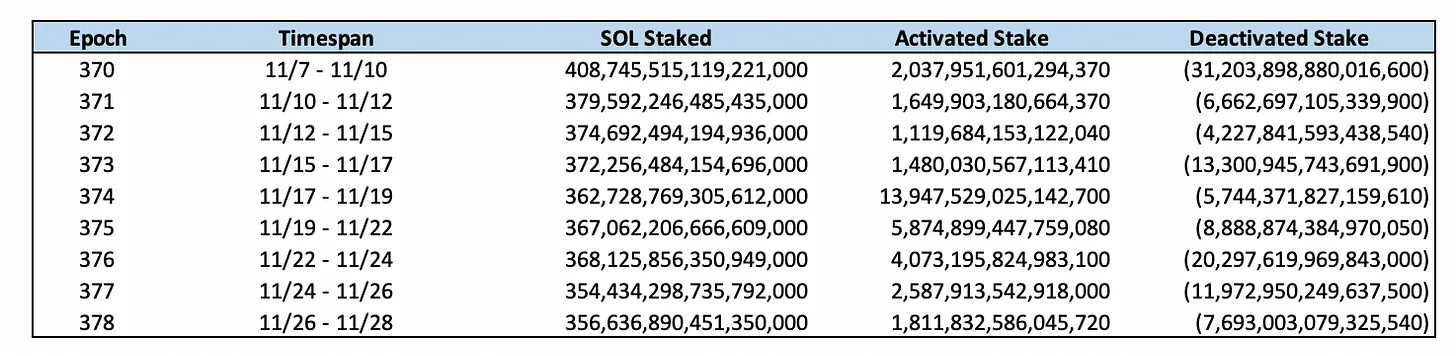 SOL สุทธิ 54.6M ถูกถอนออกไปใน 9 ยุค (ซึ่งโดยทั่วไปจะใช้เวลา 2-3 วัน) ตั้งแต่วันที่ 6 พฤศจิกายน โดยยอดรวมของ SOL ที่เดิมพันลดลง 13.2% จาก 411.2M เป็น 356.6M ซึ่งคิดเป็นประมาณ 15% ของอุปทานหมุนเวียนของ SOL