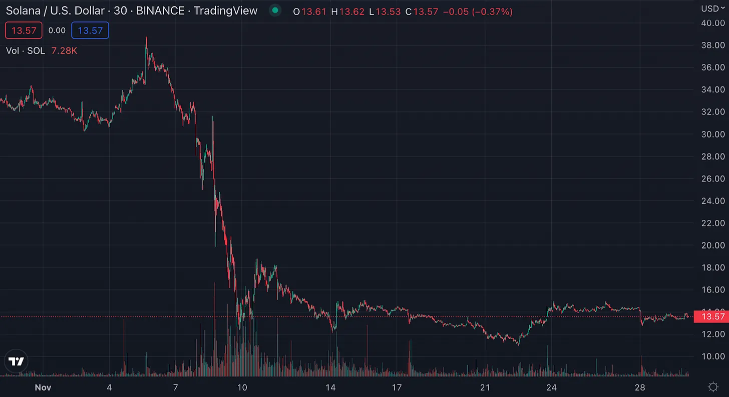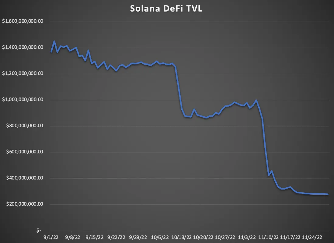 แม้ว่าจะไม่ชัดเจนว่าการลดลงเมื่อเร็วๆ นี้เกิดจาก Alameda เองหรือความกลัวในหมู่นักเทรด แต่ SOL ดิ่งลงจาก ~$35 เป็นต่ำสุดที่ ~$11 (68.5%) ในช่วงหลายสัปดาห์หลังจากการระเบิดของ FTX/Alameda