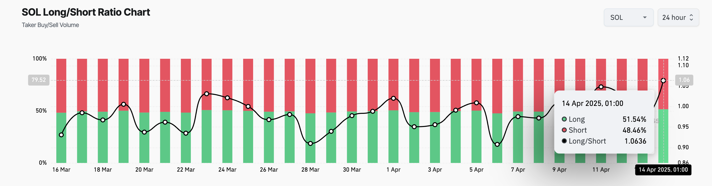 ตามข้อมูลจาก Coinglass สัดส่วน long/short ของ SOL ปัจจุบันอยู่ที่ระดับสูงสุดในรอบ 30 วันที่ 1.06 สะท้อนถึงความต้องการที่เพิ่มขึ้นในวันนี้สำหรับตำแหน่ง long