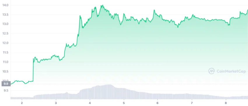 โทเค็นดั้งเดิม SOL ยังมีมูลค่าเพิ่มขึ้น 37% ในสัปดาห์ที่ผ่านมา โดยซื้อขายที่ $13.65 ณ เวลาที่เขียนบทความต้นฉบับ ประสิทธิภาพของราคาในเชิงบวกเป็นการพัฒนาที่น่ายินดีสําหรับเครือข่ายโดยพิจารณาว่ามีการซื้อขายที่ต่ำเพียง $ 8 ในสัปดาห์สุดท้ายของปี 2022 สินทรัพย์ดิจิทัลยังไต่ขึ้นสู่สินทรัพย์ดิจิทัลที่ใหญ่เป็นอันดับที่ 14 ตามมูลค่าตลาด ณ เวลาปัจจุบัน