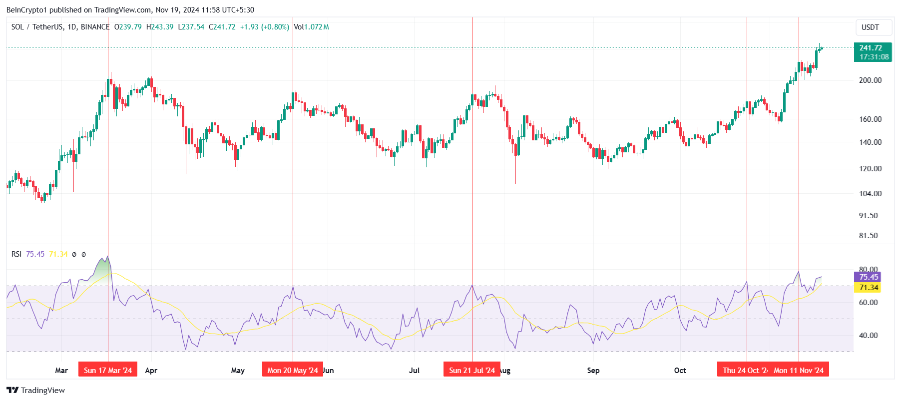 จากมุมมองทางเทคนิค ดัชนีความแข็งแกร่งสัมพัทธ์ (RSI) ของ Solana บ่งชี้ถึงสภาวะซื้อมากเกินไป โดยอยู่เหนือช่วงกลางอย่างมาก โดยปกติแล้วระดับ RSI เช่นนี้จะกระตุ้นให้เกิดการปรับฐานของราคา ซึ่งบ่งชี้ว่า SOL อาจเผชิญกับอุปสรรคระยะสั้น การลดลงของราคาอาจเกิดขึ้นเมื่อนักเทรดปรับตำแหน่งและรักษาผลกำไร ทำให้สินทรัพย์ห่างไกลจากความทะเยอทะยานในการสร้างสถิติใหม่สูงสุดตลอดกาล