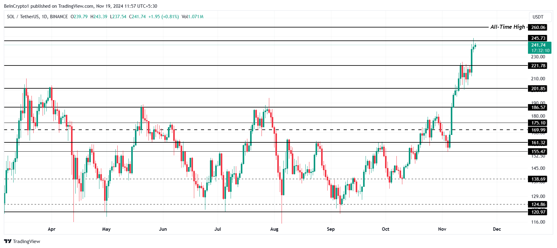 ราคาของ Solana กำลังซื้อขายอยู่เพียงแค่ต่ำกว่าระดับต้านทาน 245 USD ซึ่งเป็นอุปสรรคสุดท้ายก่อนจะทำสถิติใหม่สูงกว่า 260 USD การทะลุระดับสำคัญนี้จะยืนยันการต่อเนื่องของการรวมตัวของ SOL ทำให้สินทรัพย์สามารถกำหนดเป้าหมายใหม่ได้