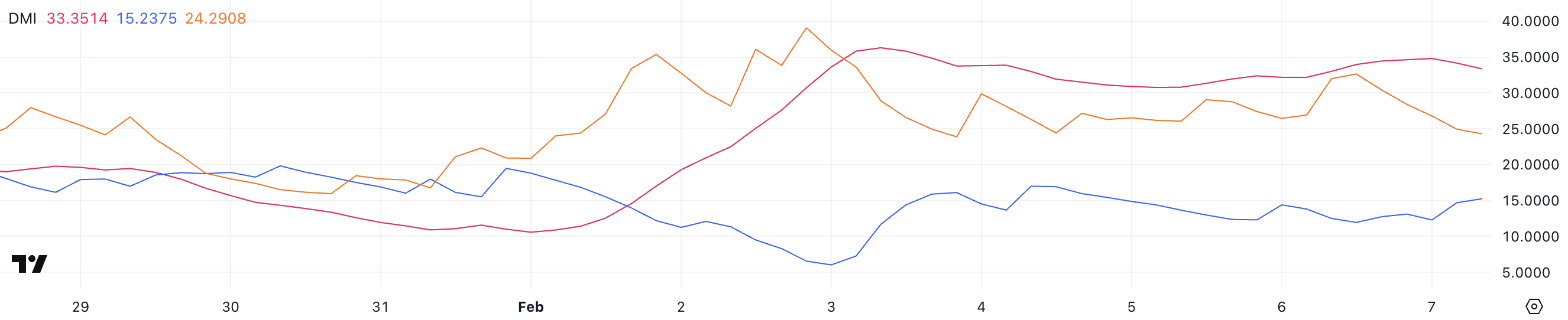 แผนภูมิ Directional Movement Index (DMI) ของ Solana แสดงให้เห็นว่า Average Directional Index (ADX) ปัจจุบันอยู่ที่ 33.3 และคงอยู่ระหว่าง 30 ถึง 35 ในช่วงสี่วันที่ผ่านมา ADX วัดความแข็งแกร่งของแนวโน้ม โดยค่าที่สูงกว่า 25 มักบ่งบอกถึงแนวโน้มที่แข็งแกร่ง และค่าที่ต่ำกว่า 20 บ่งบอกถึงการเคลื่อนไหวของราคาที่อ่อนแอหรืออยู่ในช่วง