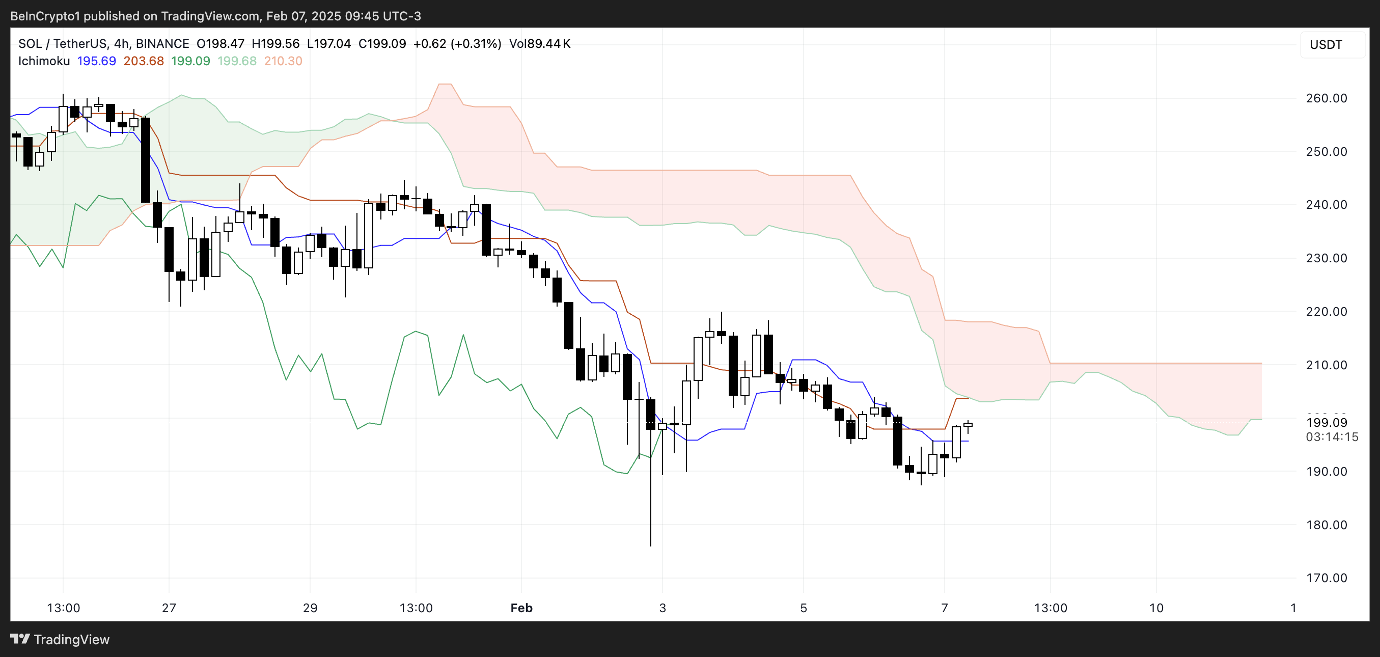 แผนภูมิ Ichimoku Cloud สำหรับ Solana แสดงการตั้งค่าขาลงเป็นหลัก ราคาซื้อขายต่ำกว่าก้อนเมฆ และก้อนเมฆเองก็มีสีแดง ซึ่งบ่งบอกถึงแรงกดดันขาลงที่ต่อเนื่อง