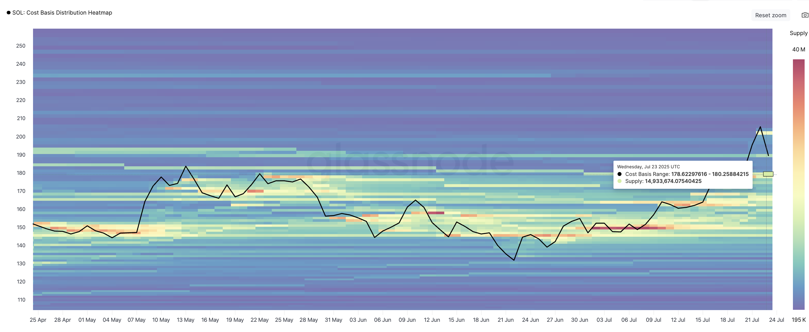 สิ่งต่อไปที่ต้องจับตามองคือว่า Solana จะรักษาระดับสนับสนุนปัจจุบันได้หรือไม่ แผนที่ความร้อนของต้นทุนแสดงกลุ่มการสะสมกระเป๋าเงินหนาแน่นระหว่าง 175 USD ถึง 180 USD ซึ่งเป็นหนึ่งในโซนที่แข็งแกร่งที่สุดตั้งแต่เดือนเมษายน นี่คือจุดที่ผู้ค้าหลายคนซื้อและมีแนวโน้มที่จะปกป้องตำแหน่งของพวกเขา อุปทานรวมในโซนนี้รวมเป็น 38,964,258 SOL