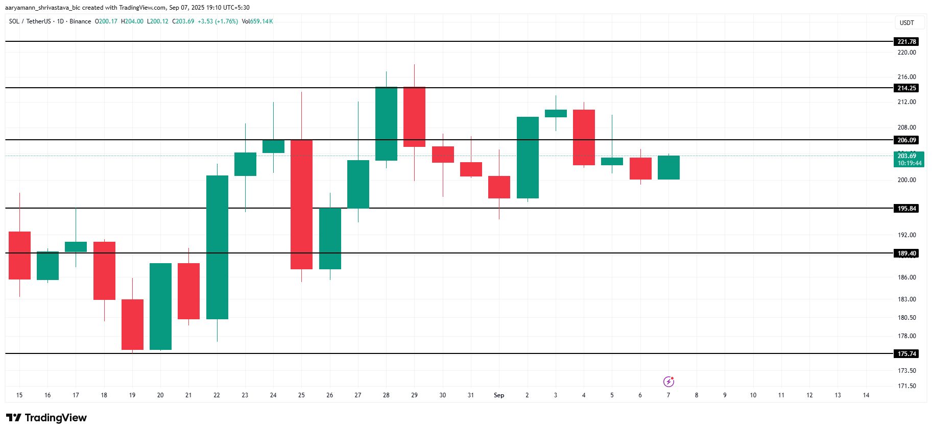 ณ เวลาที่เขียนบทความนี้ Solana มีราคา อยู่ที่ 203 USD ซึ่งต่ำกว่าระดับต้านทานที่ 206 USD เล็กน้อย การรักษาระดับเหนือ 200 USD ยังคงเป็นกุญแจสำคัญ เนื่องจากเป็นพื้นฐานสำหรับการเพิ่มขึ้นในระยะใกล้