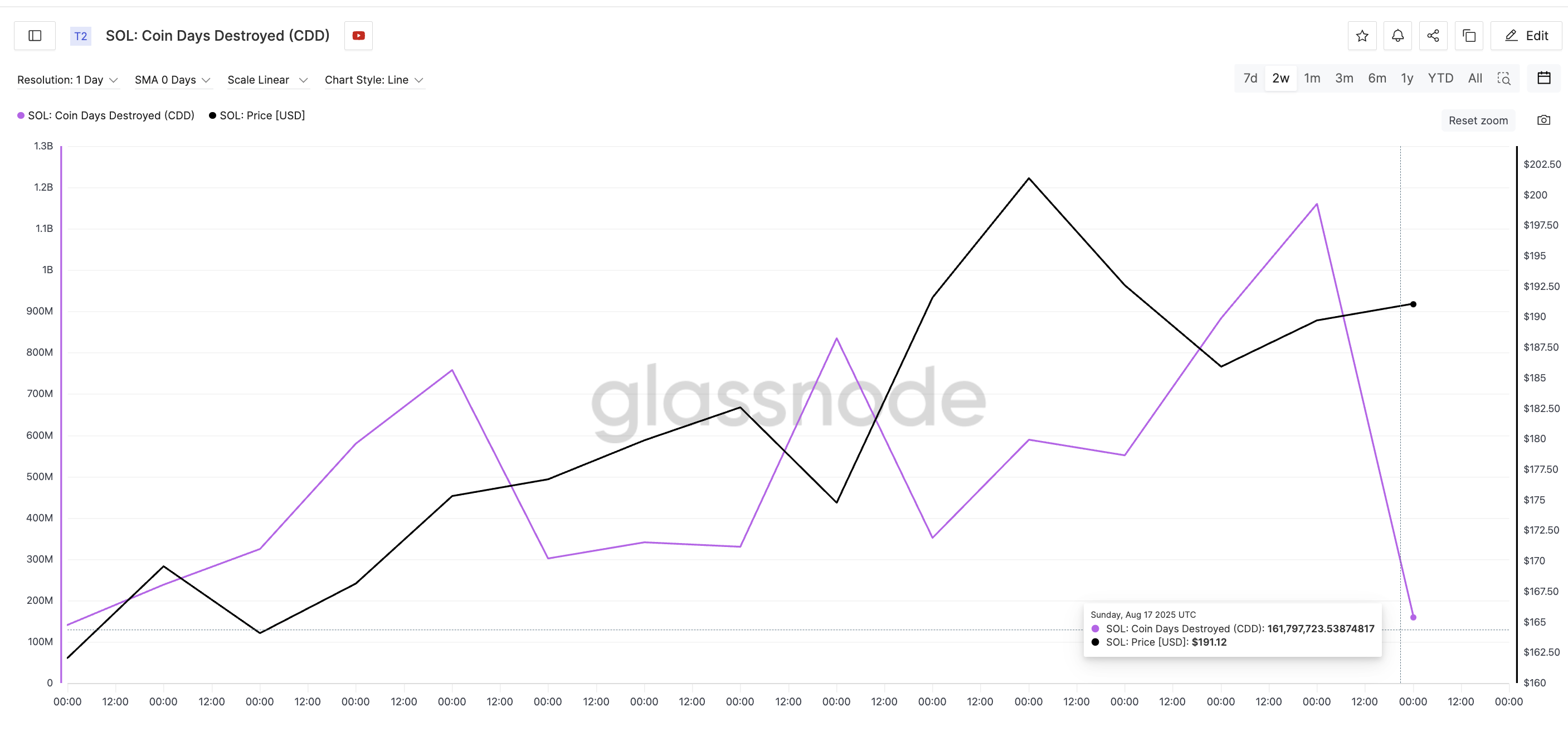 เมื่อวันที่ 17 สิงหาคม ตัวชี้วัด Coin Days Destroyed (CDD) ของ Solana ลดลงเหลือ 161.79 ล้าน ซึ่งเป็นค่ารายวันที่ต่ำที่สุดเป็นอันดับสองของเดือนนี้ เพียงวันเดียวก่อนหน้านั้น ในวันที่ 16 สิงหาคม CDD ได้พุ่งขึ้นถึง 1.16 พันล้าน นั่นคือการลดลง 86% ในการทำลายวันของ coin ในวันเดียว