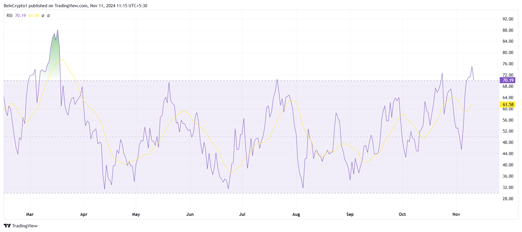 แรงผลักดันระยะยาวของ Solana แสดงสัญญาณของการขยายตัวมากเกินไป ดัชนีความแข็งแกร่งสัมพัทธ์ (RSI) ซึ่งเป็นตัวบ่งชี้ทางเทคนิคที่สำคัญ ปัจจุบันแสดงให้เห็นว่า Solana อยู่ในโซนซื้อมากเกินไป