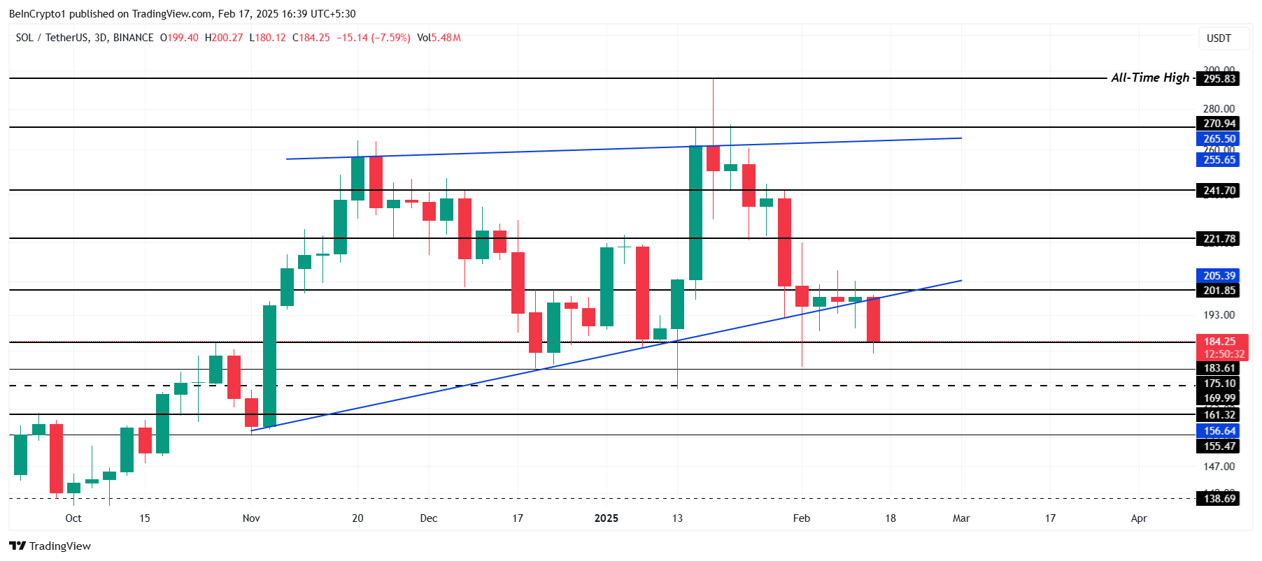 ราคาของ Solana ลดลง 7% ในช่วง 24 ชั่วโมงที่ผ่านมา โดยซื้อขายที่ 177 ดอลลาร์ และยังคงอยู่เหนือระดับแนวรับที่ 175 ดอลลาร์ อย่างไรก็ตาม Altcoin เพิ่งหลุดจากรูปแบบลิ่มขาขึ้น ซึ่งบ่งชี้ว่าราคาอาจยังคงลดลงต่อไป หากแนวโน้มขาลงในปัจจุบันยังคงอยู่ Solana อาจประสบปัญหาในการรักษาระดับเหนือแนวรับที่สำคัญ