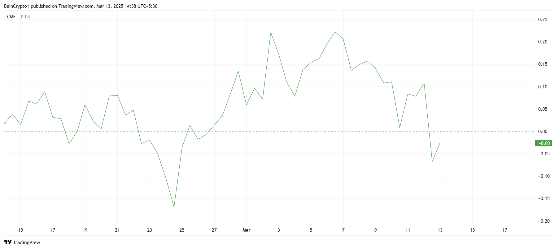 ในระดับที่กว้างขึ้น Solana ก็กำลังประสบกับแรงกระตุ้นทางเศรษฐกิจที่อ่อนแอ ซึ่งเน้นโดยตัวชี้วัดทางเทคนิค Chaikin Money Flow (CMF) ซึ่งวัดการไหลของเงินที่มีน้ำหนักตามปริมาณเข้าและออกจากสินทรัพย์ ได้บันทึกการลดลงอย่างรวดเร็ว CMF ขณะนี้อยู่ต่ำกว่าเส้นศูนย์ บ่งชี้ว่าการไหลออกมีอิทธิพลเหนือการไหลเข้า