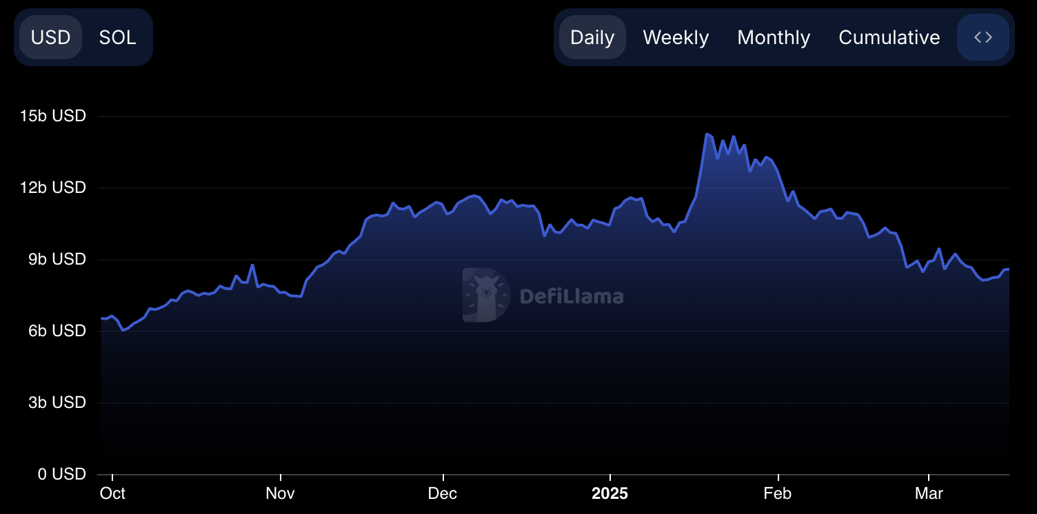 Total Value Locked (TVL) ของ Solana อยู่ที่ 8.57 พันล้าน USD โดยยังคงต่ำกว่า 10 พันล้าน USD ตั้งแต่วันที่ 23 กุมภาพันธ์