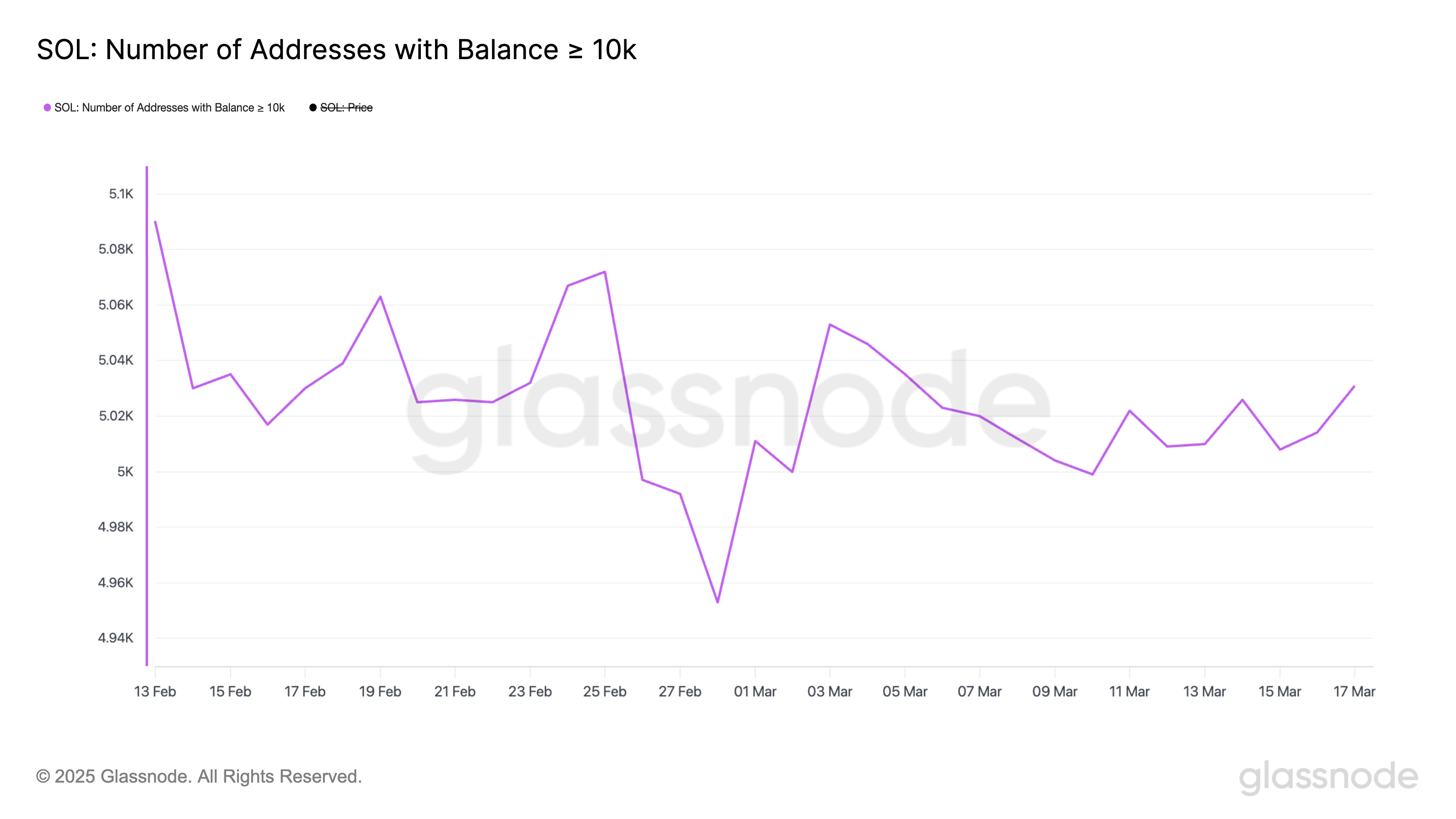 จำนวนวาฬ Solana – ที่อยู่ที่ถืออย่างน้อย 10,000 SOL – ปัจจุบันอยู่ที่ 5,031 เพิ่มขึ้นเล็กน้อยจาก 5,008 เพียงสองวันที่ผ่านมา