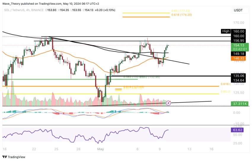 ปัจจุบัน SOL ดูเหมือนจะรักษาโมเมนตัมขาขึ้น โดยพบกับแนวต้านที่สําคัญอีกครั้งในช่วง $157 ถึง $160 การทะลุแนวต้านนี้สามารถขับเคลื่อน SOL ไปสู่แนวต้าน Fibonacci ที่สําคัญที่ประมาณ 175 ดอลลาร์ ซึ่งถือเป็นการสิ้นสุดระยะการปรับฐานที่อาจเกิดขึ้น