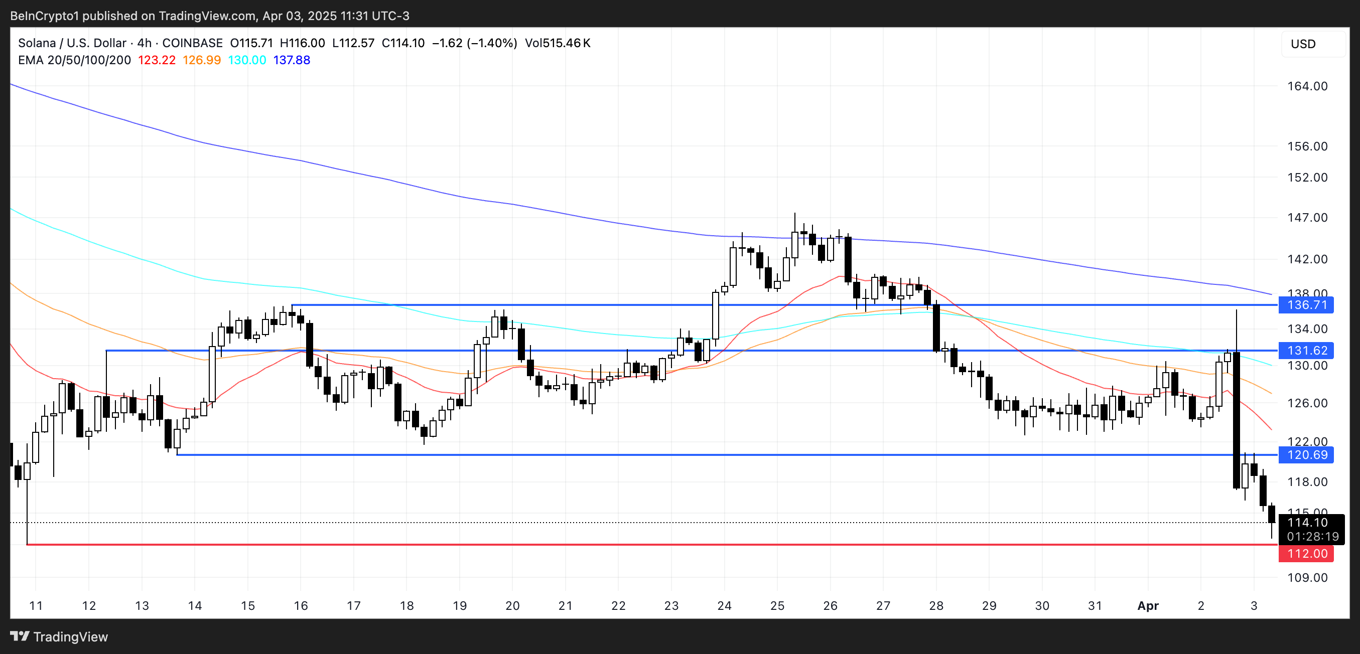 ราคาของ Solanaได้ลดลงต่ำกว่าระดับสำคัญที่ 115 USD และการสนับสนุนหลักถัดไปอยู่ที่ประมาณ 112 USD การเคลื่อนไหวที่ยืนยันต่ำกว่าระดับนี้อาจกระตุ้นให้เกิดการลดลงต่อไป ซึ่งอาจผลักดันราคาให้ต่ำกว่า 110 USD เป็นครั้งแรกตั้งแต่กุมภาพันธ์ 2024