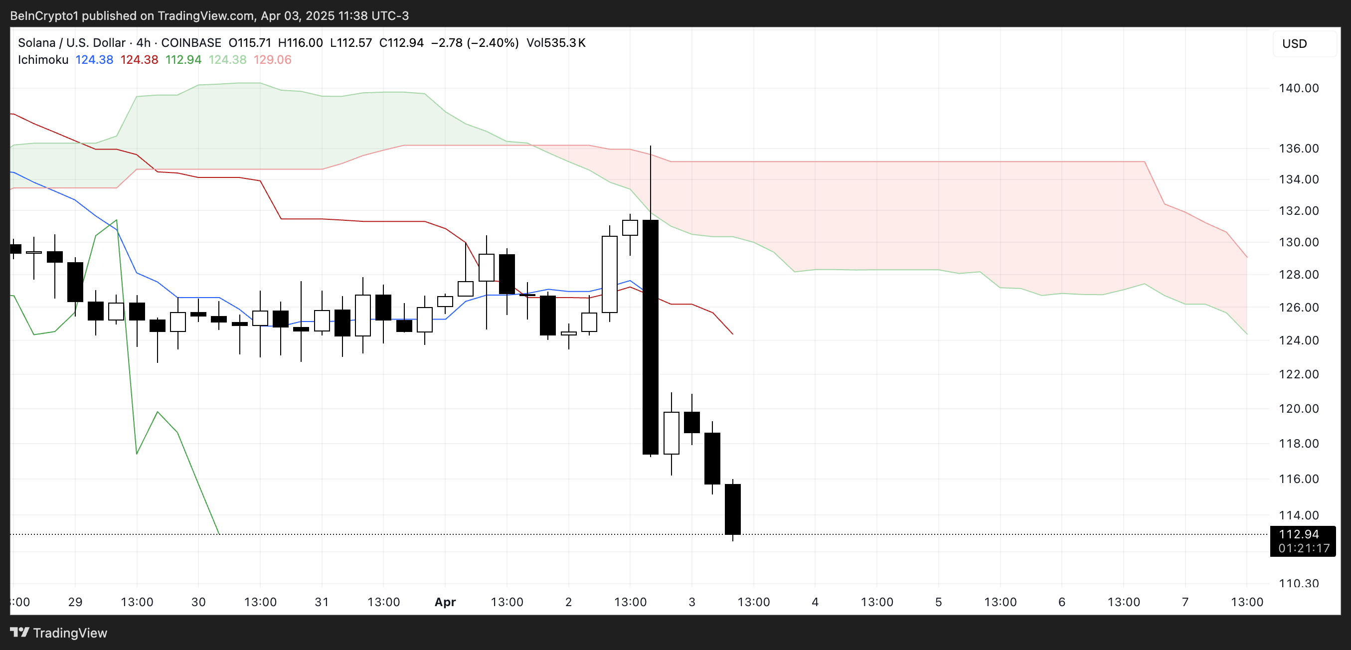แผนภูมิ Ichimoku Cloud ของ Solana กำลังแสดงสัญญาณขาลงที่แข็งแกร่ง ราคาลดลงอย่างรวดเร็วต่ำกว่าทั้ง Tenkan-sen (เส้นสีน้ำเงิน) และ Kijun-sen (เส้นสีแดง) ยืนยันการปฏิเสธระดับแนวรับระยะสั้นอย่างชัดเจน