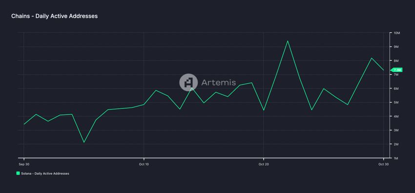 ในเดือนตุลาคม ความต้องการของผู้ใช้บน Solana ได้พุ่งสูงขึ้นอย่างมาก ตามที่สะท้อนโดยการเพิ่มขึ้นของที่อยู่ที่ใช้งานอยู่รายวัน ในช่วง 31 วันนั้น จำนวนที่อยู่ที่ไม่ซ้ำกันซึ่งทำธุรกรรมบน L1 มีทั้งหมด 123 ล้านที่อยู่ ซึ่งเป็นจำนวนสูงสุดตั้งแต่ต้นปี นอกจากนี้ยังแสดงถึงการเพิ่มขึ้น 41% จาก 86 ล้านที่อยู่ที่ไม่ซ้ำกันในเดือนกันยายน