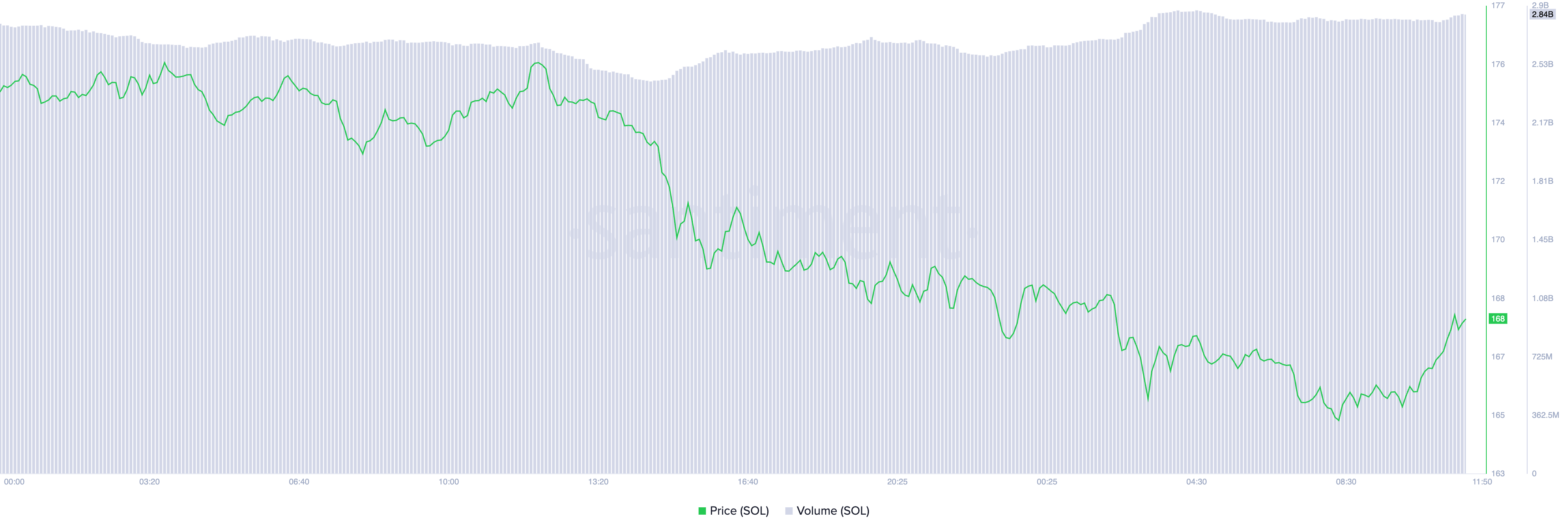 SOL มีราคาอยู่ที่ 168.01 USD ณ ปัจจุบัน ซึ่งสะท้อนถึงการลดลง 4% ในช่วง 24 ชั่วโมงที่ผ่านมา ขณะเดียวกัน การเพิ่มขึ้น 6% ของปริมาณการซื้อขายบ่งชี้ถึงกิจกรรมการขายที่เพิ่มขึ้นในตลาด
