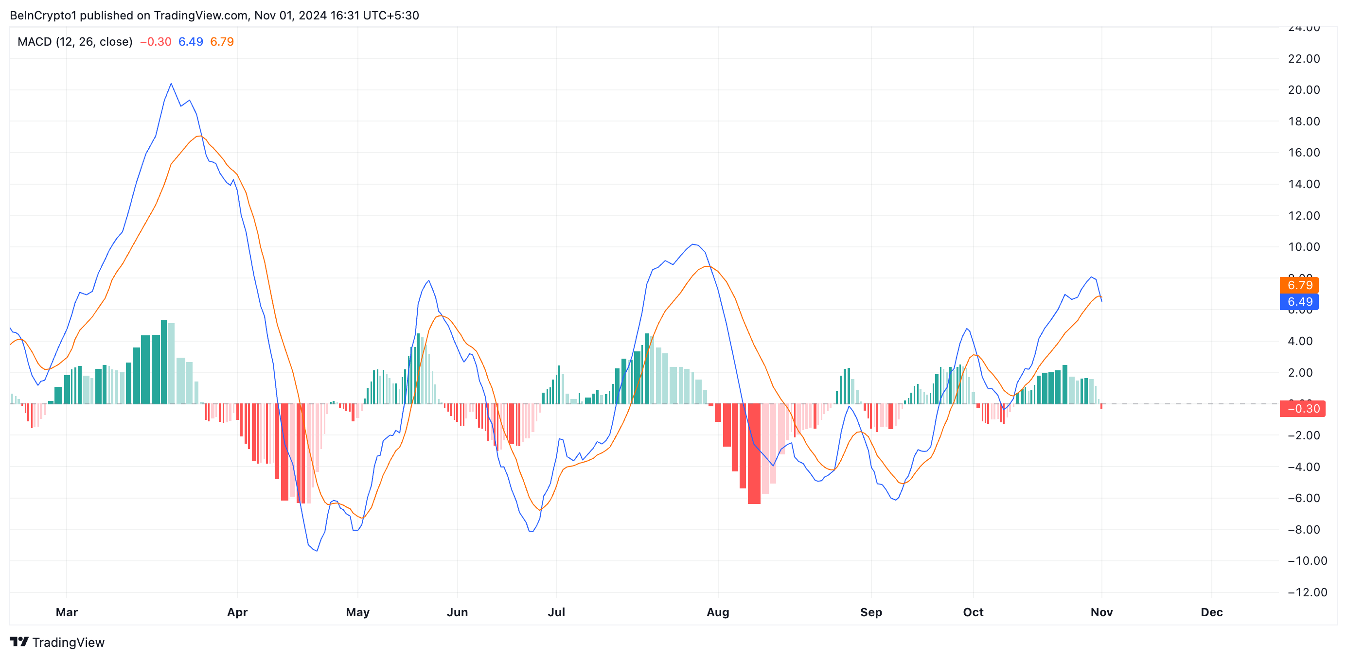 ตัวบ่งชี้ MACD วัดแนวโน้มราคาและโมเมนตัมของสินทรัพย์และระบุสัญญาณซื้อหรือขายที่เป็นไปได้ เมื่อเส้น MACD ตกลงไปต่ำกว่าเส้นสัญญาณ มันบ่งบอกถึงการกลับตัวของแนวโน้มเป็นขาลง ซึ่งบ่งชี้ว่าโมเมนตัมของสินทรัพย์กำลังอ่อนแอลง ผู้ค้ามักมองการข้ามนี้เป็นสัญญาณให้พิจารณาขายหรือลดสถานะ