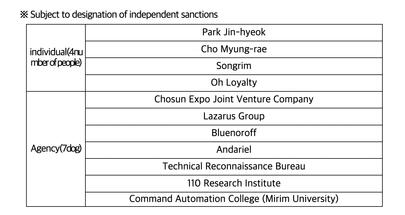 อ้างอิงจากข่าวประชาสัมพันธ์ของกระทรวงการต่างประเทศเกาหลีใต้ รัฐบาลเกาหลีใต้ได้ออกมาตรการคว่ำบาตรนักลงทุนรายบุคคลชาวเกาหลีเหนือจำนวนสี่คนและรายสถาบันจำนวนเจ็ดแห่งเนื่องจากการทำกิจกรรมทางไซเบอร์ที่ผิดกฎหมาย ภาพหน้าจอที่แนบมาด้านล่างแสดงให้เห็นรายชื่อผู้ที่ถูกลงโทษ