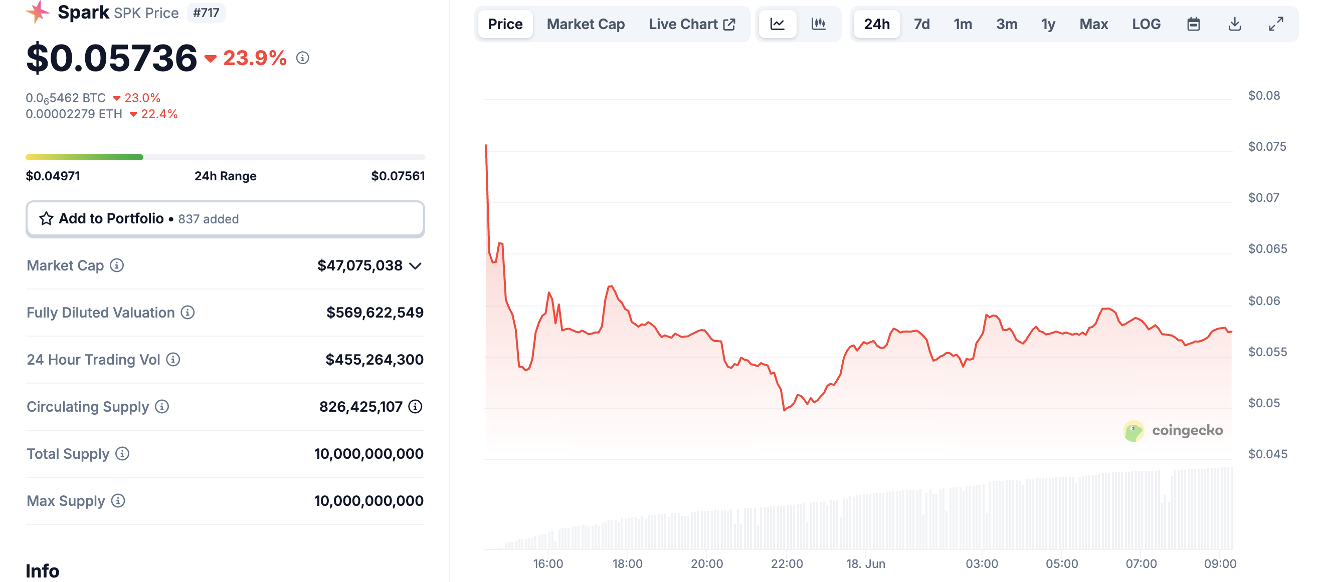 การเปิดตัวที่แข็งแกร่งของโทเค็นทำให้มันพุ่งขึ้นสู่จุดสูงสุดตลอดกาลที่ $0.075 อย่างรวดเร็ว โทเค็น SPK ยังได้อันดับที่สองในบรรดาสกุลเงินดิจิทัลที่มีแนวโน้มสูงสุดบน CoinGecko อย่างไรก็ตาม การพุ่งขึ้นในช่วงแรกกลับสั้นลงอย่างรวดเร็ว.
