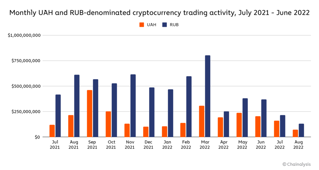ปริมาณการค้าในยูเครนเพิ่มขึ้น 121% สู่ระดับ 307 ล้านดอลลาร์ ในขณะที่ปริมาณการค้าสกุลเงินรูเบิลของรัสเซียเพิ่มขึ้น 35% เป็น 805 ล้านดอลลาร์หลังจากสงครามเริ่มขึ้นในเดือนมีนาคม แม้ว่าวอลลูมจะเริ่มลดลงในช่วงสิงหาคมก็ตาม