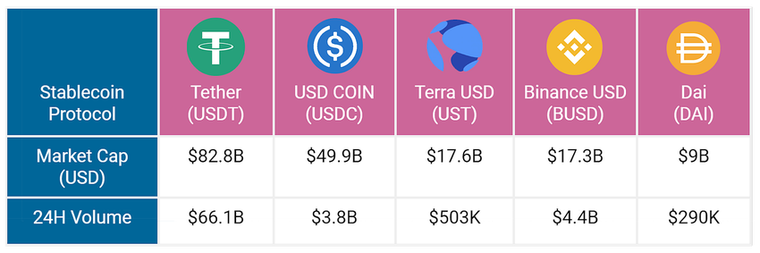 Stablecoin หลายตัวนั้น Peg อยู่กับ Fiat currency แต่ Terra นั้นไม่ใช่แบบนั้น มันเป็นเหรียญที่ถูกออกแบบมาให้ถูก Backed โดยเหรียญ Luna-Terra สำหรับเหรียญอื่นๆอย่าง BUSD,USDC นั้นมาจากการ Backed โดยกำไรของ Binance หรือ DAI นั้นถูก Backed โดยเหรียญใดๆที่เอาไปค้ำประกันเช่น ETH เพื่อให้ได้ DAI มา USDT มาจากการ Backed โดยดอลล่าร์แบบ 1:1
