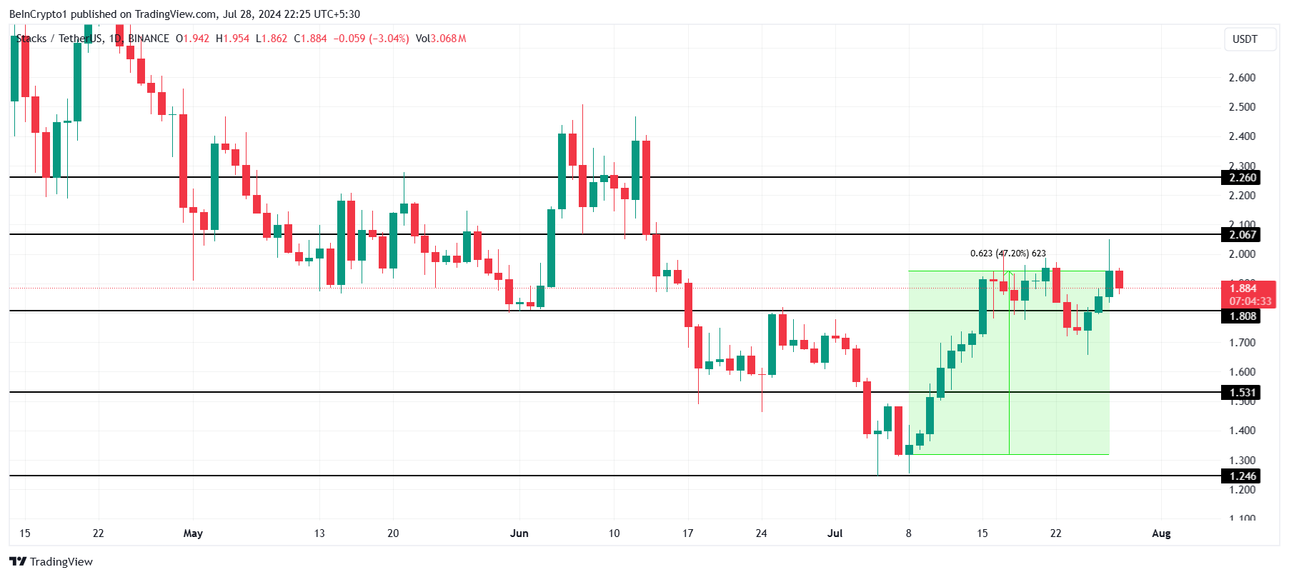 ปัจจุบัน STX อยู่ที่ 1.88 ดอลลาร์ โดยพบขาขึ้นจากตลาดซึ่งกําลังล้มเหลว ในช่วงสามสัปดาห์ที่ผ่านมา altcoin ได้สังเกตเห็นการเติบโตที่โดดเด่น ซึ่งทําให้เป็นตัวเลือกที่ดีสําหรับการลงทุน
