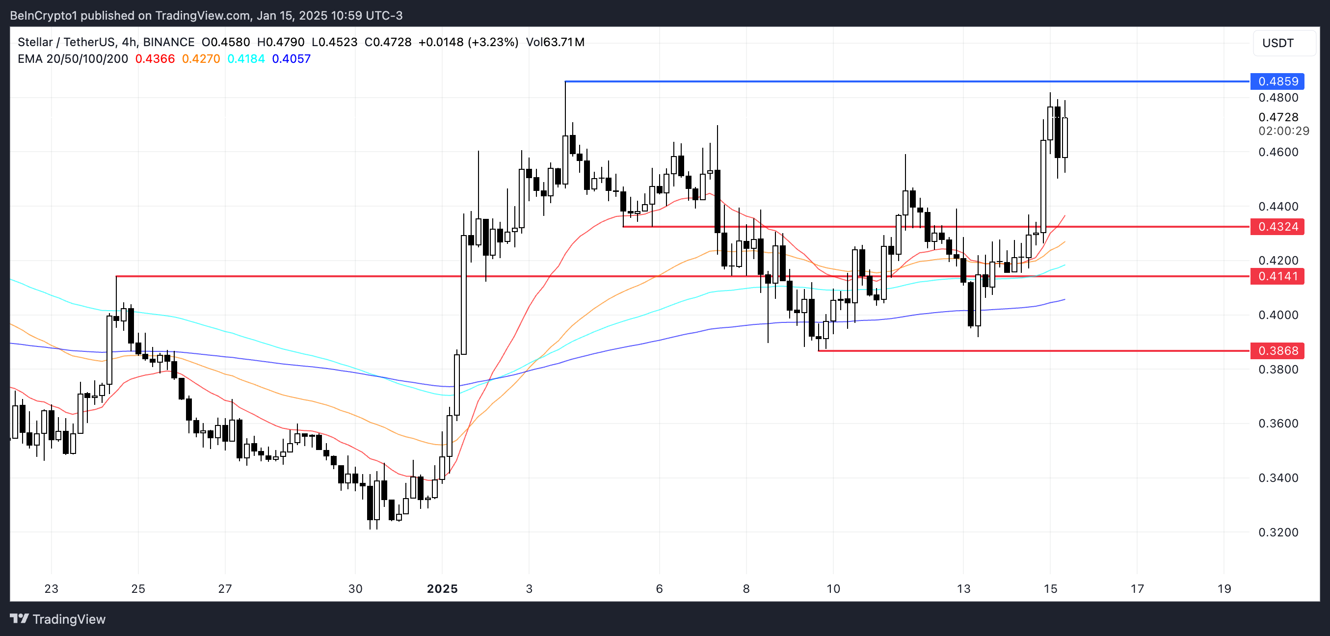 Stellar เส้น EMA แสดงการตั้งค่าขาขึ้น โดยเส้นระยะสั้นอยู่เหนือเส้นระยะยาวและช่องว่างระหว่างพวกมันกว้างขึ้น การตั้งค่านี้บ่งบอกถึงแรงผลักดันขาขึ้นที่แข็งแกร่งและความมั่นใจที่เพิ่มขึ้นในแนวโน้มขาขึ้นปัจจุบัน