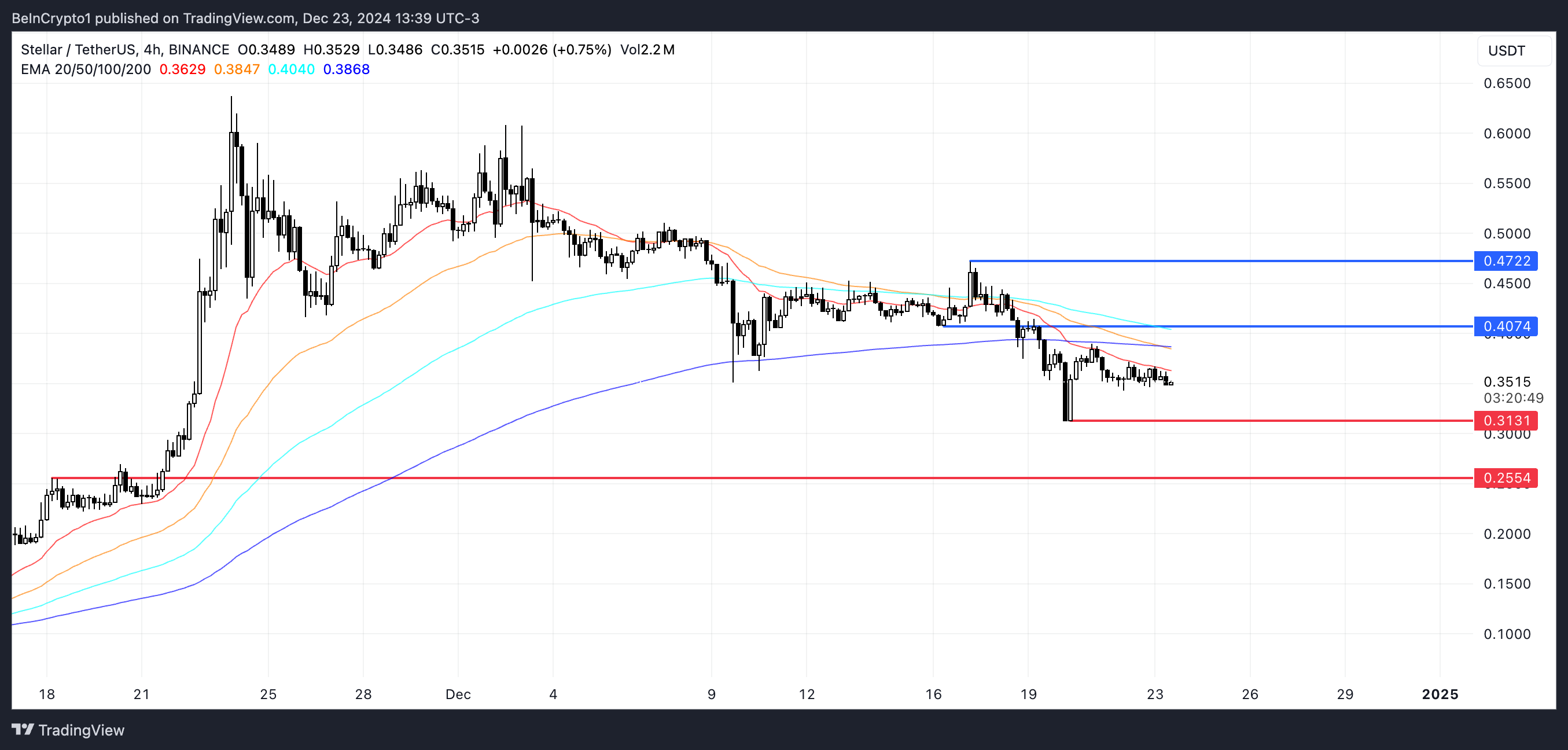 ราคาของ Stellar (XLM) เผชิญกับสัญญาณทางเทคนิคที่ขัดแย้งกัน ขณะที่แนวโน้มขาลงยังคงลึกขึ้น โดย coin ลดลง 29% ในช่วง 30 วันที่ผ่านมา จากระดับสูงสุดตั้งแต่ปี 2021 การเกิด death cross เมื่อวันที่ 20 ธันวาคม บ่งบอกถึงแรงกดดันขาลงที่เพิ่มขึ้น แม้ว่าการเพิ่มขึ้นของกิจกรรมการซื้ออาจบ่งชี้ถึงการกลับตัวของแนวโน้มที่เป็นไปได้