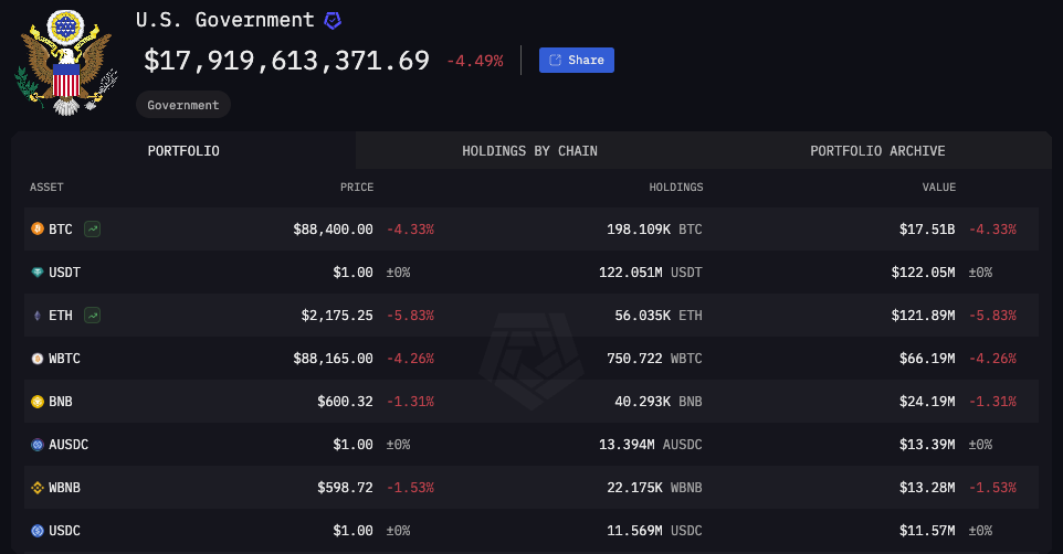 ข้อมูลจาก Arkham Intelligence แสดงให้เห็นว่ารัฐบาลสหรัฐฯ ถือครอง BTC จำนวน 198,109 ในกระเป๋าเงินสาธารณะของตน มีมูลค่า 17.5 พันล้าน USD ตามราคาตลาดปัจจุบัน