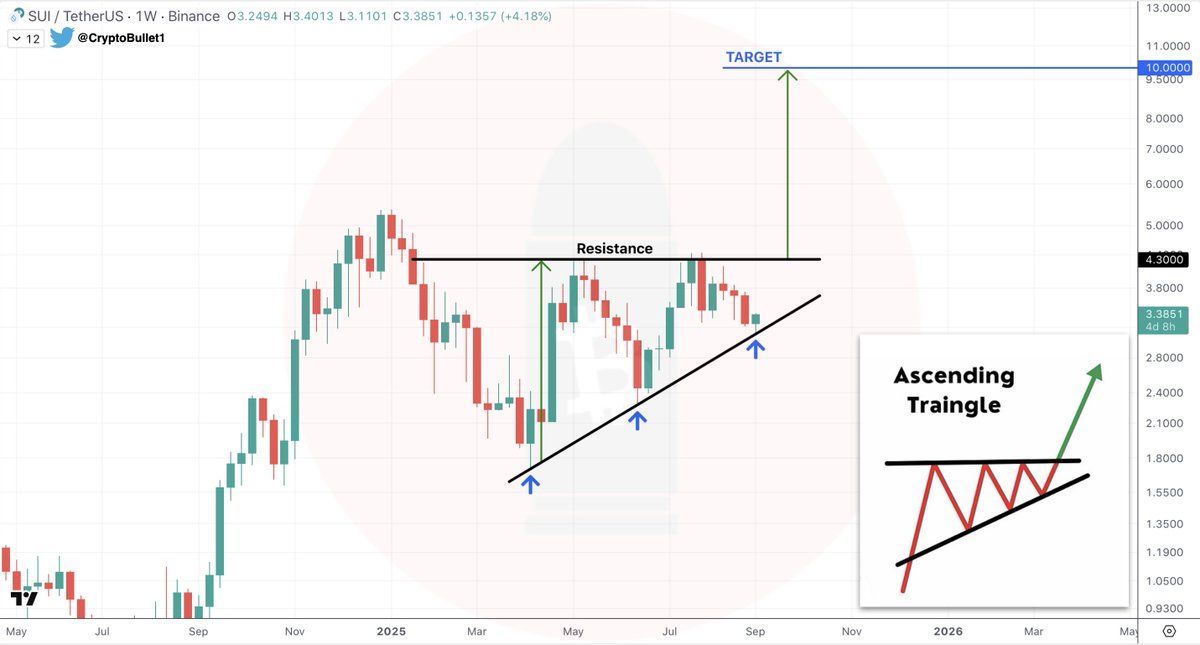 จากมุมมองทางเทคนิค ภาพรวมทั้งบีบอัดและมีเสียงรบกวน นักวิเคราะห์บางคนชี้ให้เห็นถึงรูปแบบ Ascending Triangle ที่มีแนวต้านใกล้ USD 4.3 บนกราฟรายสัปดาห์ การทะลุผ่านที่ชัดเจนอาจตั้งเป้าหมายระดับสูงขึ้น โดยมีการคาดการณ์ที่มองในแง่ดีบางส่วนที่มองไปที่ระดับ USD 10