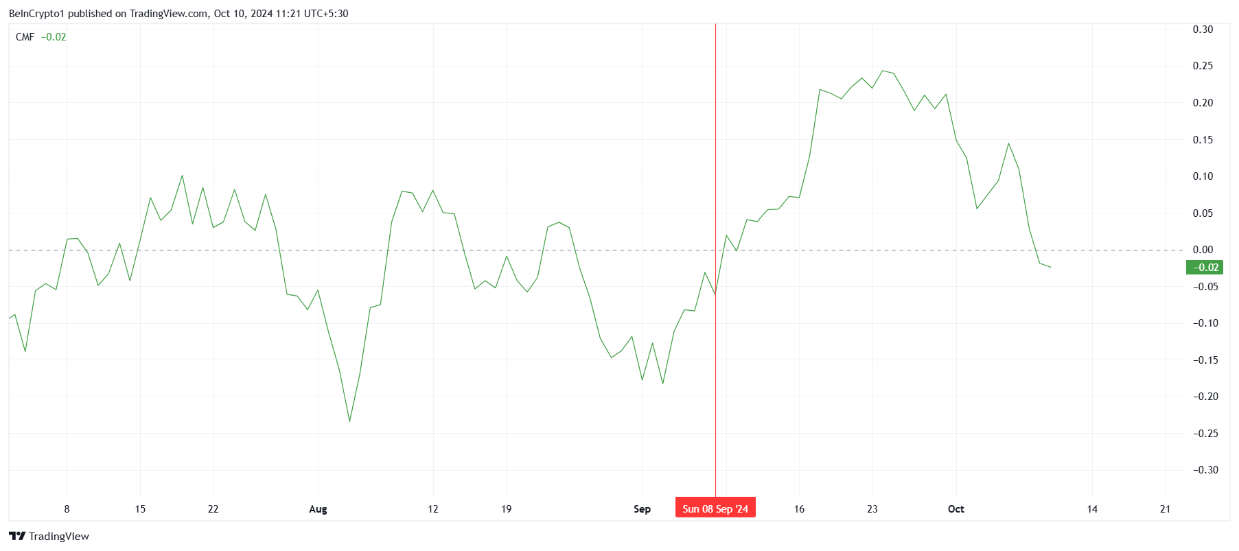 ในระดับมหภาค ตัวชี้วัดทางเทคนิคเช่น Chaikin Money Flow CMF กำลังส่งสัญญาณถึงแรงขายสำหรับ SUI ตั้งแต่ต้นเดือน CMF แสดงถึงการไหลออกอย่างต่อเนื่อง โดยการไหลออกเพิ่มขึ้นในช่วงไม่กี่วันที่ผ่านมา ปัจจุบัน ตัวชี้วัด CMF อยู่ต่ำกว่าเส้นศูนย์ ซึ่งยืนยันว่านักลงทุนกำลังถอนเงินออกจากสินทรัพย์