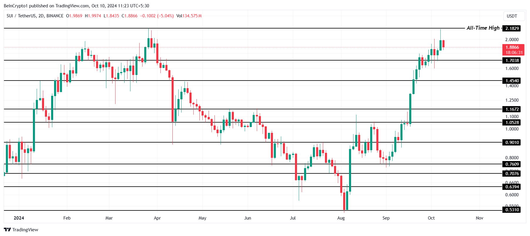 ราคาของ SUI กำลังสูญเสียแรงหนุนจากกระแสขาขึ้นที่ทำให้มันไปถึงราคาสูงสุดตลอดกาลที่ 2.18 ดอลลาร์ ด้วยความสนใจที่ลดลงจากผู้ถือและสัญญาณตลาดที่เป็นลบ Crypto เหรียญนี้มีแนวโน้มที่จะสูญเสียการสนับสนุนที่ระดับ 1.70 ดอลลาร์ การหลุดระดับนี้จะยืนยันถึงแนวโน้มที่อ่อนแอลงของ SUI
