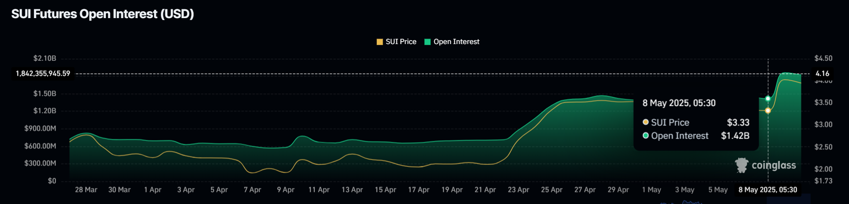 Open Interest ใน SUI ได้เพิ่มขึ้น 28% ในเวลาเพียง 48 ชั่วโมง โดยเพิ่มจาก 1.42 พันล้าน USD เป็น 1.82 พันล้าน USD การเพิ่มขึ้น 400 ล้าน USD นี้บ่งชี้ถึงความสนใจที่เพิ่มขึ้นในตลาด Futures โดยที่นักเทรดต่างกระตือรือร้นที่จะใช้ประโยชน์จากโมเมนตัมขาขึ้นของ altcoin นี้