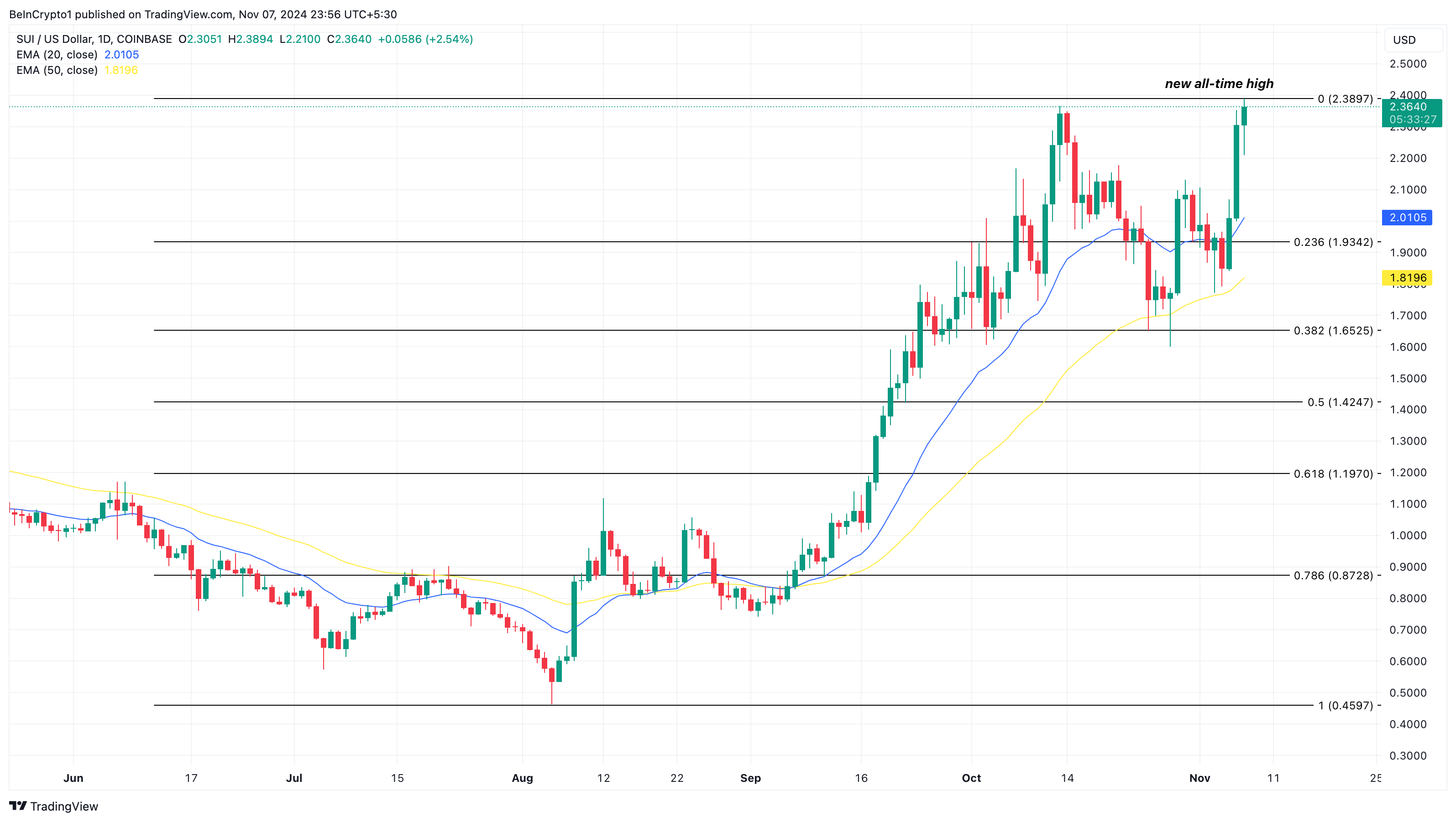 ตรงกับชัยชนะของ Donald Trump ในการเลือกตั้งประธานาธิบดีสหรัฐฯ ล่าสุด แต่ในตอนแรกยังไม่สามารถทำลายสถิติได้ ในการวิเคราะห์นี้ BeInCrypto อธิบายว่า SUI อาจจะพุ่งสูงขึ้นไปอีกมากกว่ามูลค่าปัจจุบัน