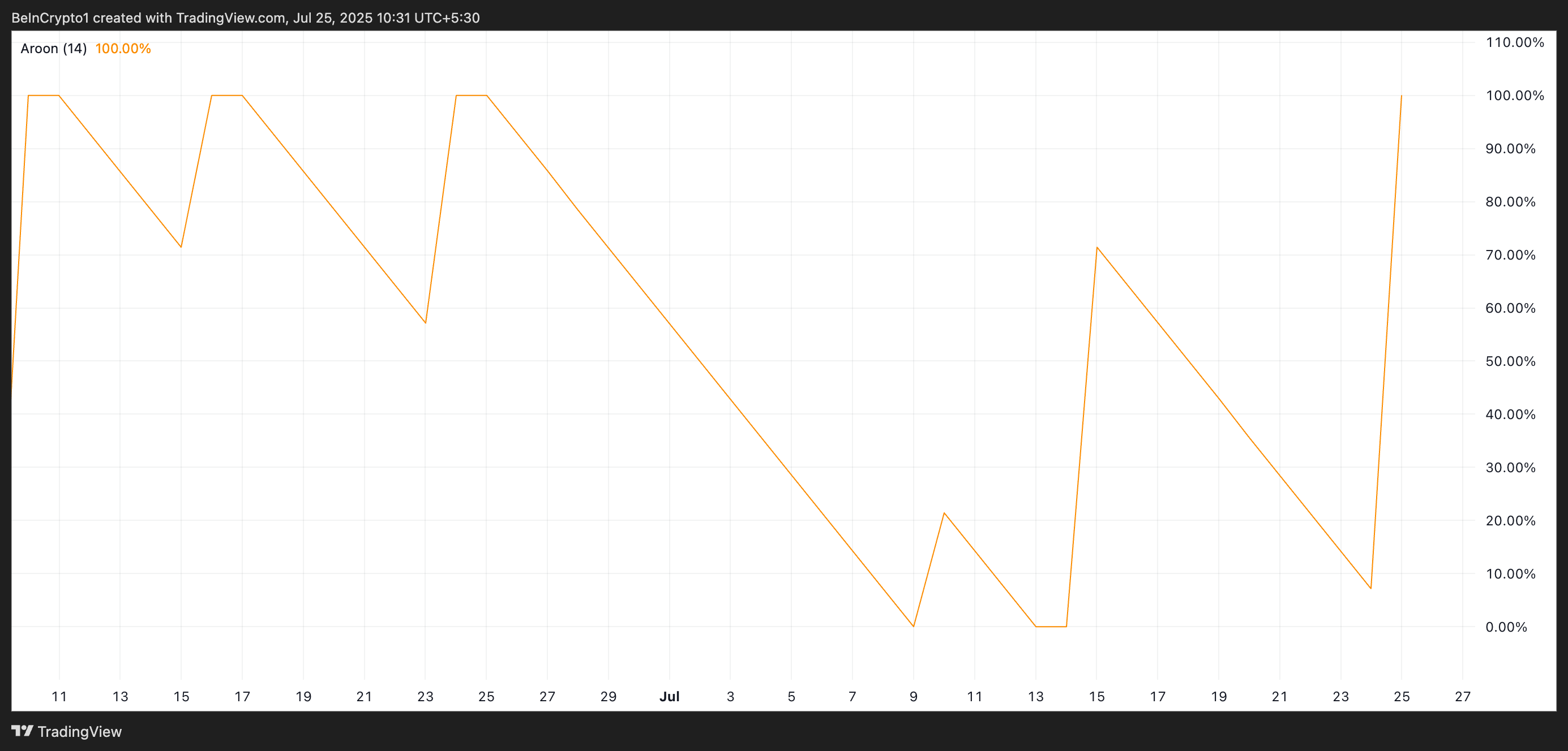 ตัวชี้วัด Aroon เป็นเครื่องมือวิเคราะห์ทางเทคนิคที่วัดเวลาที่ผ่านไปตั้งแต่จุดสูงสุดหรือจุดต่ำสุดล่าสุดเพื่อระบุทิศทางและความแข็งแกร่งของแนวโน้ม เมื่อเส้น Up Line อยู่ที่หรือใกล้ 100% แสดงว่าราคาของสินทรัพย์ได้ทำจุดสูงสุดใหม่ ซึ่งบ่งบอกถึงแรงซื้อที่แข็งแกร่ง