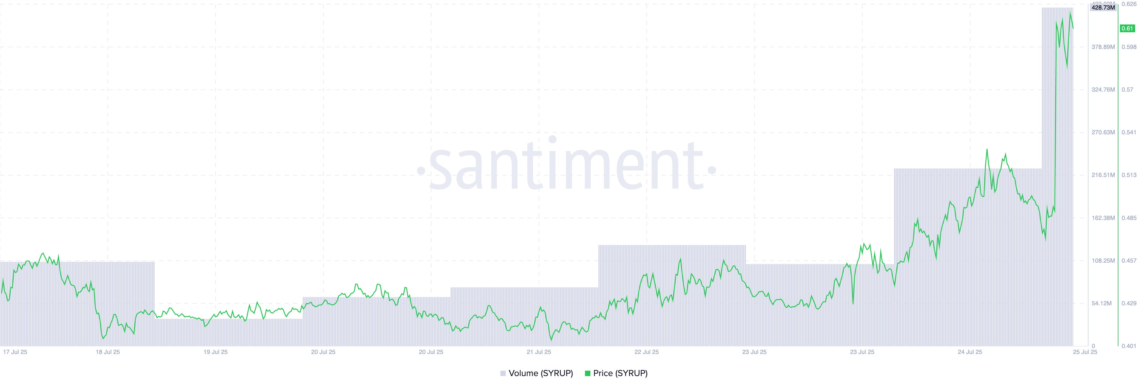 แม้ว่าการลดลงของราคาของ BTC ต่ำกว่า $118,000 ได้ ลดความสนใจของนักลงทุนในสินทรัพย์หลายรายการในวันนี้ แต่ SYRUP ได้โพสต์ปริมาณการซื้อขายใน 24 ชั่วโมงที่เกิน $420 ล้าน ข้อมูลบนเชนแสดงให้เห็นว่ามีการเพิ่มขึ้นกว่า 230% ขณะที่ราคาของ altcoin พุ่งขึ้น